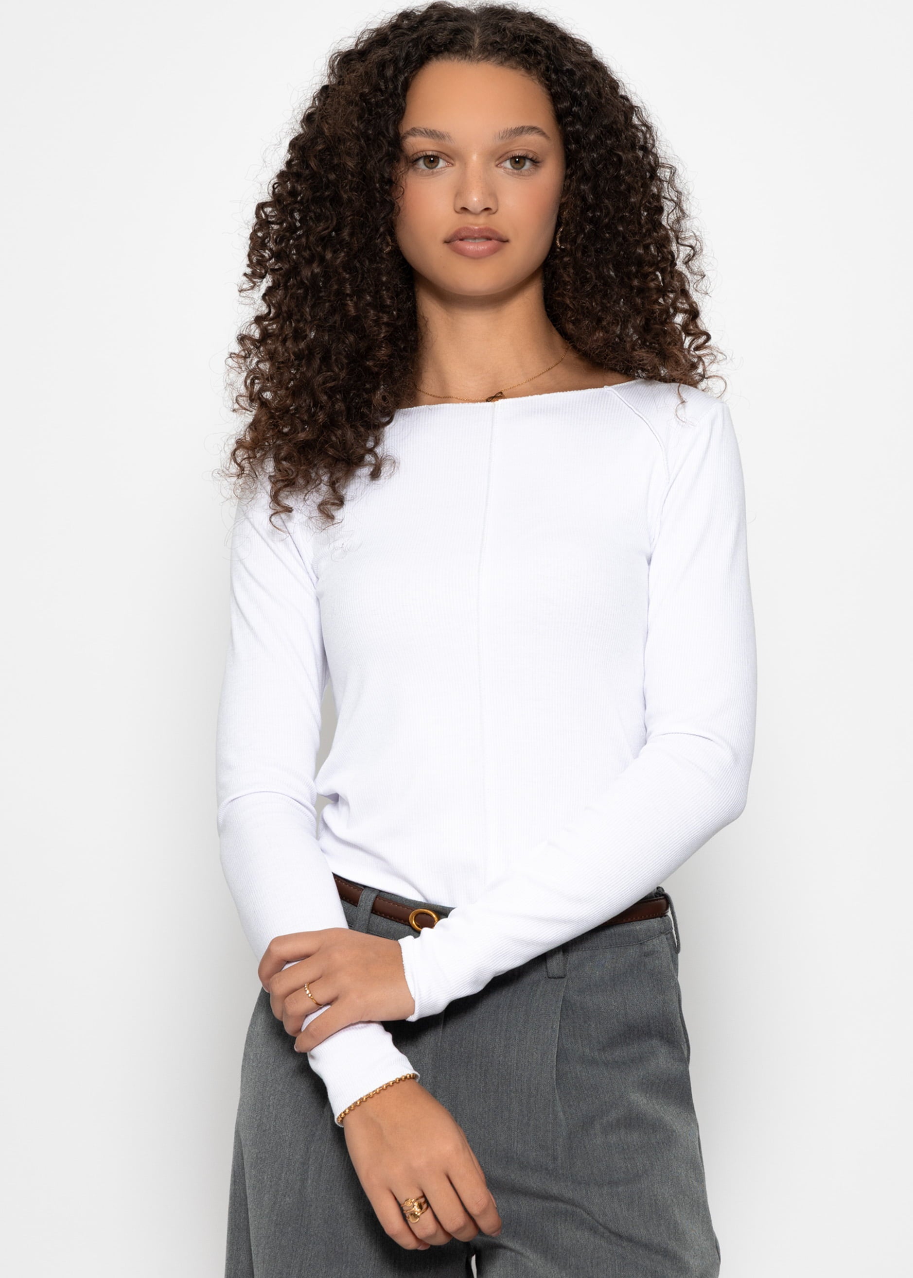 Black long-sleeved shirt with decorative stitching. Slim-fit design in soft, finely ribbed jersey with a round neckline. A simple basic for versatile combinations.