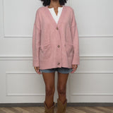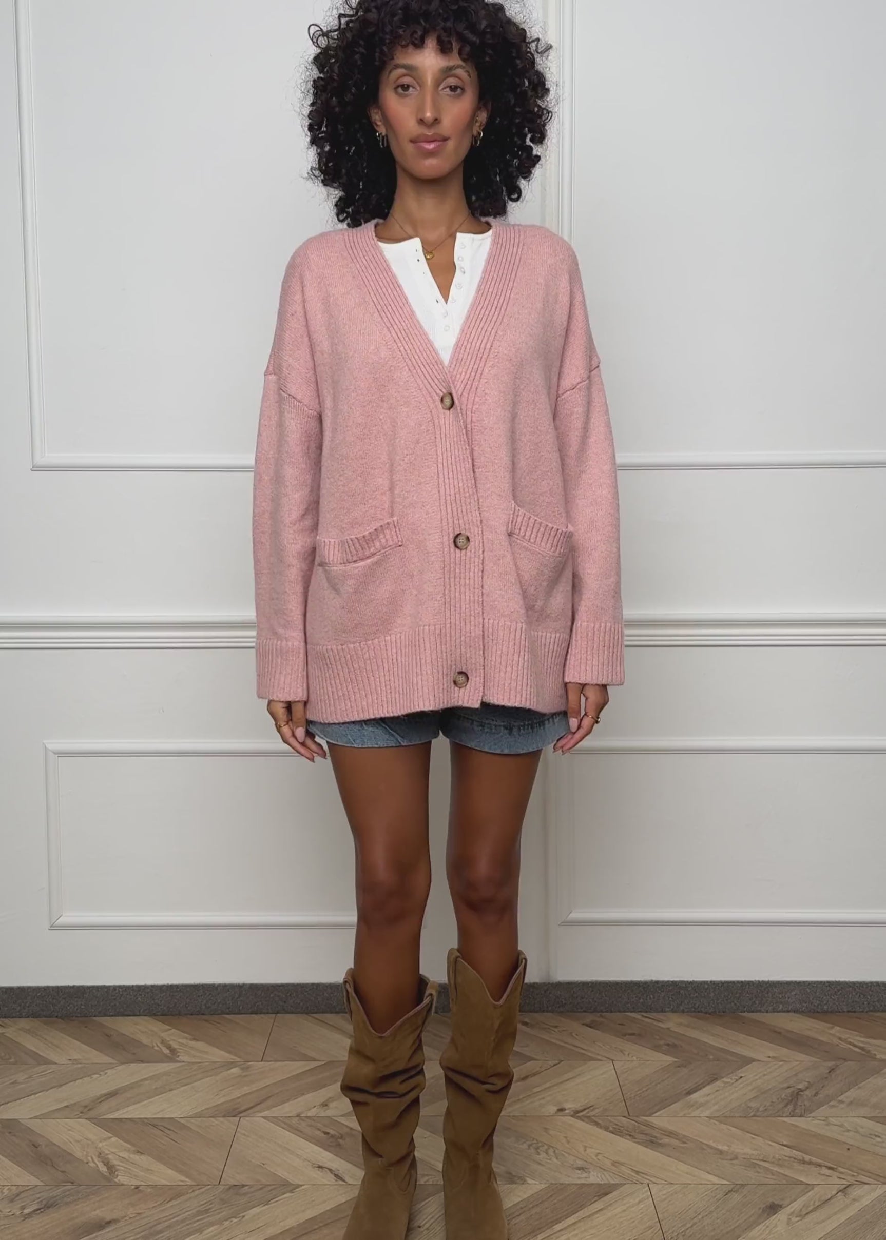 Knitted cardigan with distinctive ribbed texture on the V-neck, button placket, and hem. Two patch pockets and dropped shoulders emphasize the casual oversized look. Soft knit fabric ensures a comfortable fit.