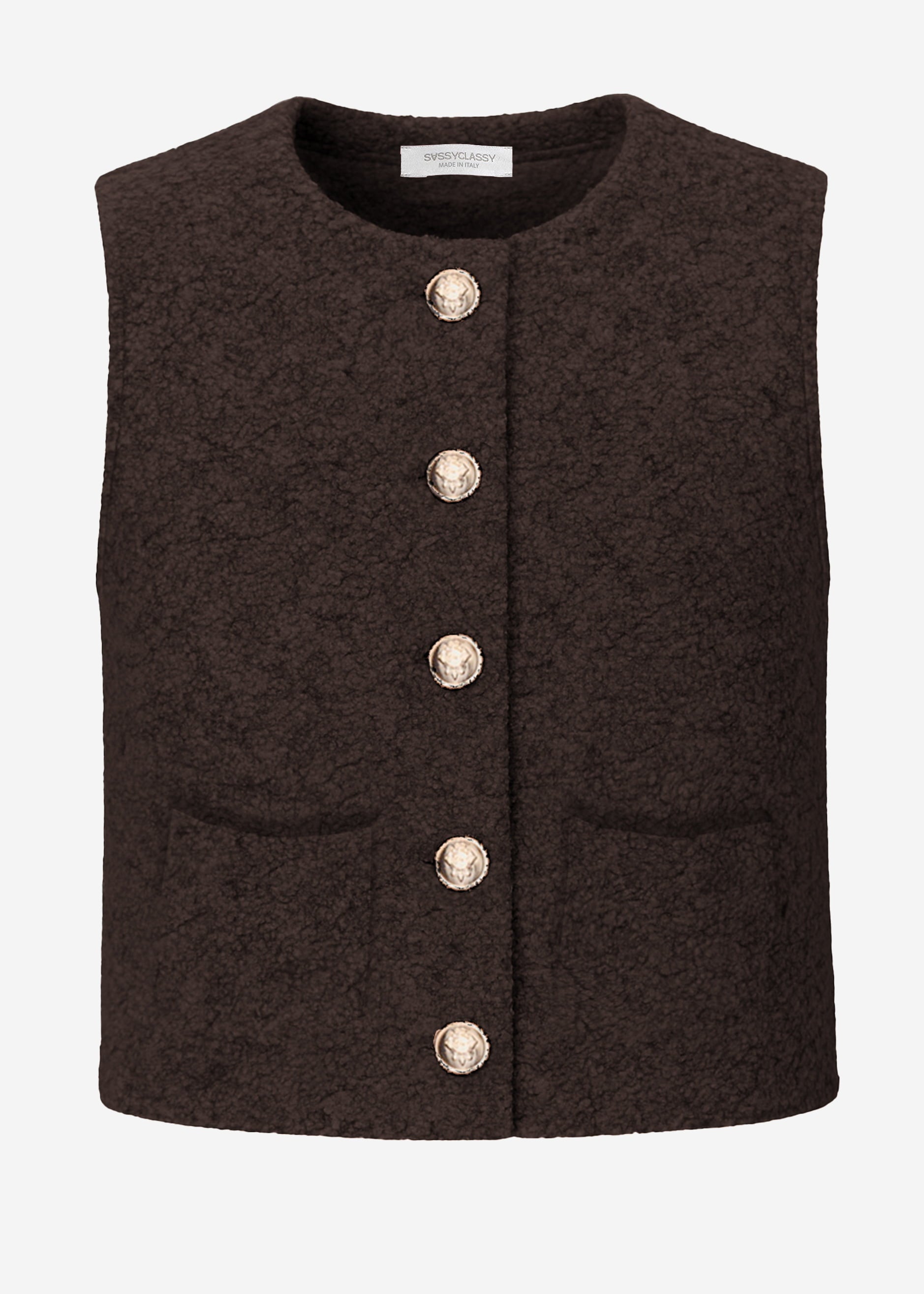 Bouclé-Weste aus weichem, strukturierten Stoff mit zeitloser Optik. Goldfarbene Knöpfe und aufgesetzte Taschen ergänzen das Design. Die legere, leicht oversize Passform ermöglicht vielseitige Kombinationsmöglichkeiten.