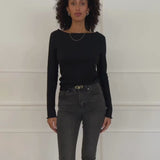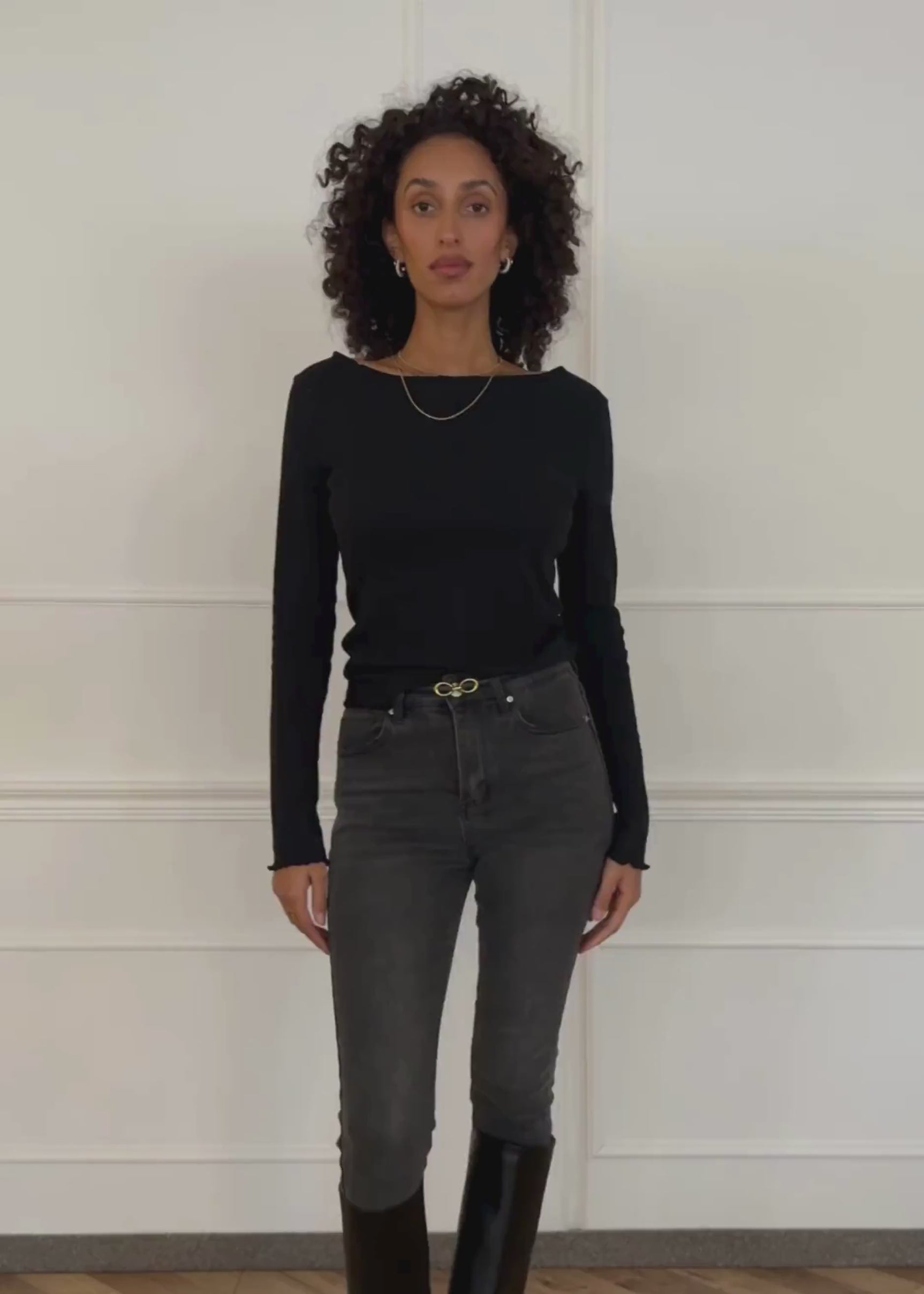 Black pointelle long-sleeved top with a feminine openwork pattern and elegant boat neckline. The figure-hugging cut features long sleeves and a slightly wavy hem for a subtle, playful touch. A versatile basic, ideal for both elegant and casual looks.