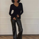 Black ribbed knit long-sleeved top with a fine texture and a feminine cut-out neckline with a tie. The figure-hugging cut features slightly flared sleeve cuffs and a wavy hem for a playful touch. A stylish essential that adds a modern and elegant touch to simple looks.