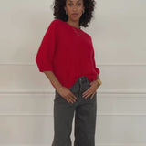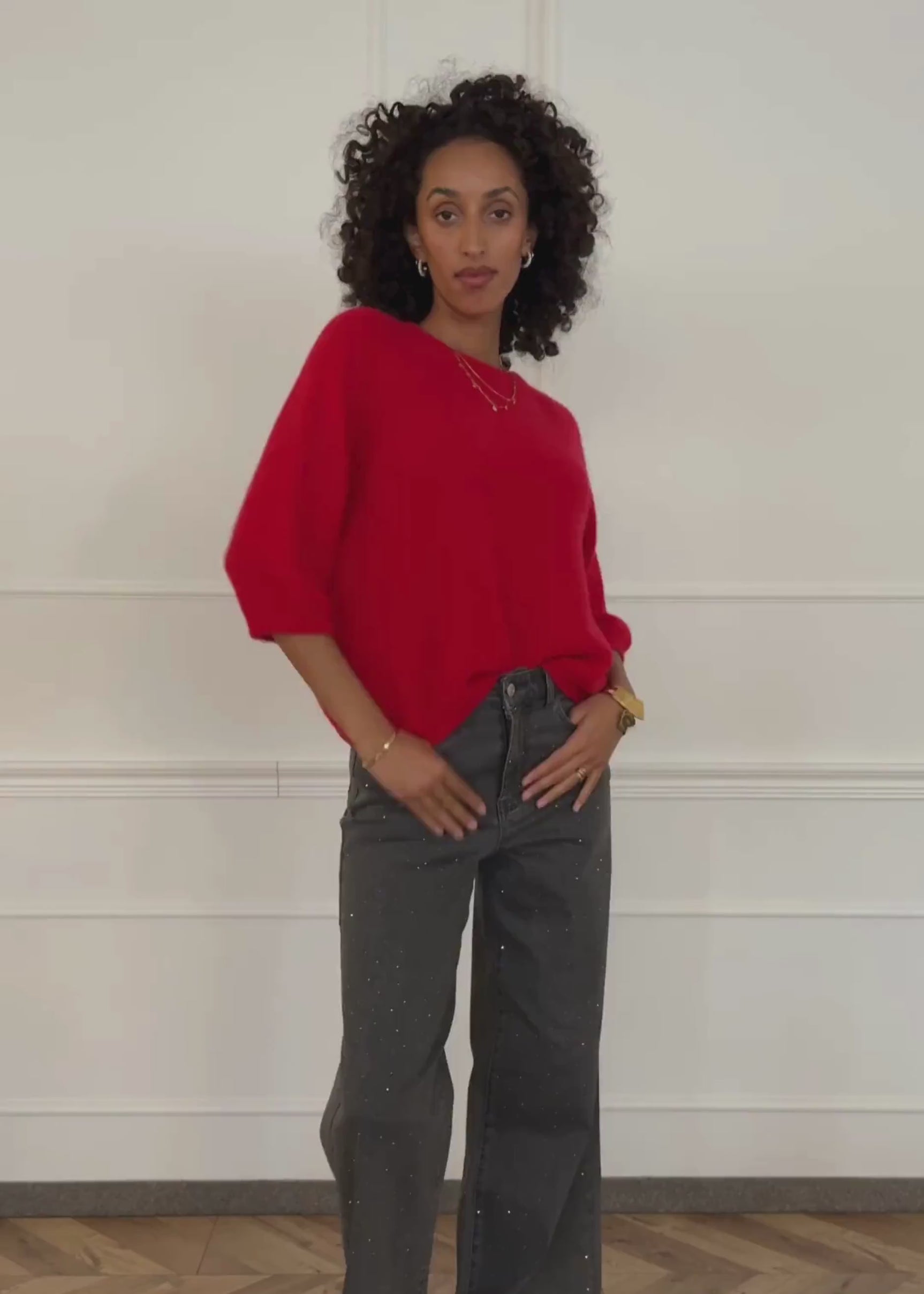 This red knit top combines timeless elegance with cozy comfort. It features a round neckline and half-length sleeves made from soft knit fabric.