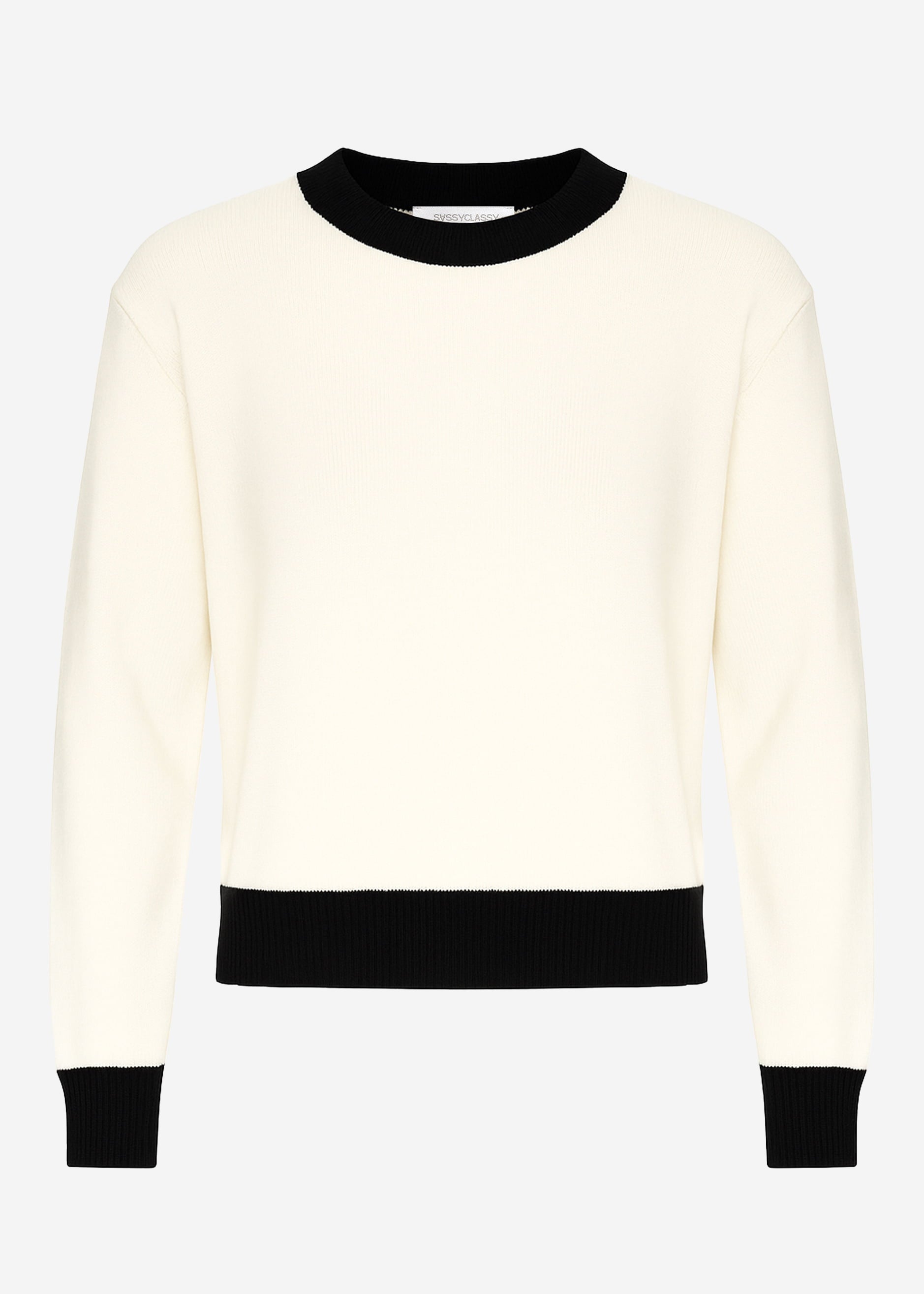 This fine-knit sweater made from a soft viscose blend combines timeless elegance with a modern design. The offwhite base tone is accentuated by stylish, contrasting black trims on the round neck, sleeves, and hem, giving the sweater a sophisticated touch. Thanks to the soft material, it feels comfortable against the skin while offering a form-fitting fit. The straight cut ensures a high level of comfort and makes the sweater a versatile piece, whether worn casually with jeans, elegantly with leather leggings, or for a classic office look.