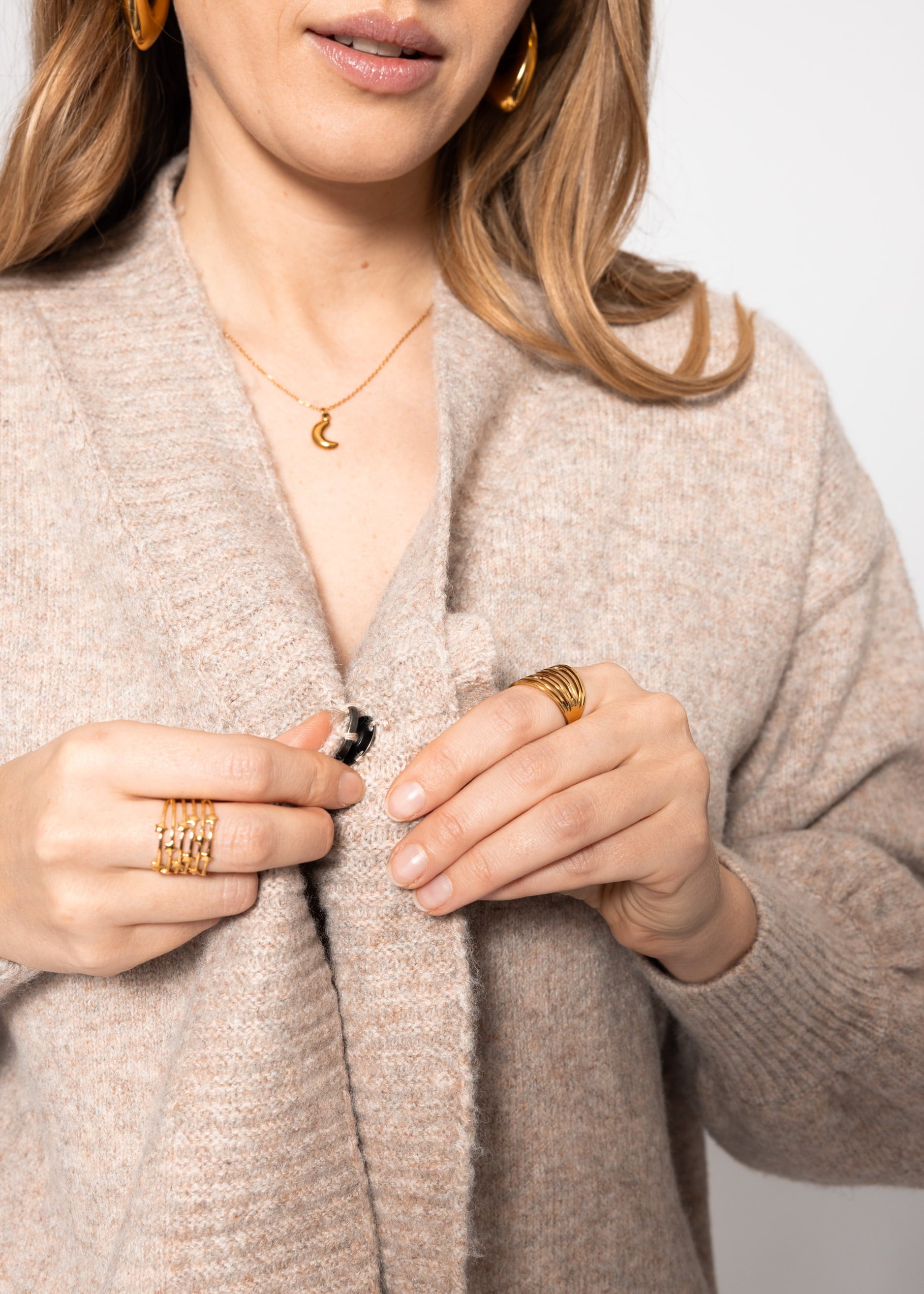 Delicate cardigan in pink with soft, fluffy knit and elegant V-neck. The decorative fabric flower on the snap fastener is a special eye-catcher. Wide ribbed cuffs and slightly ballooned sleeves round off the feminine look.