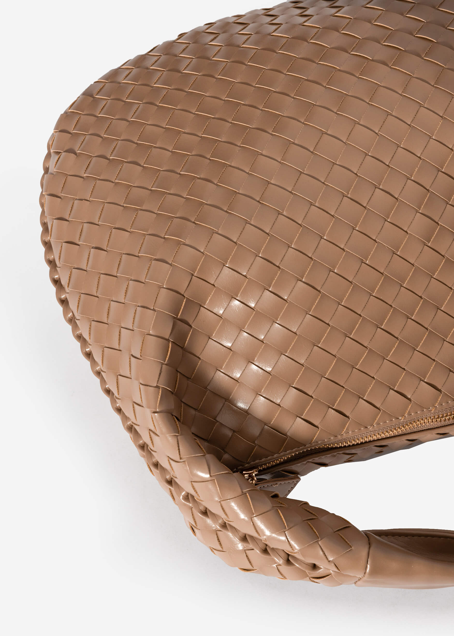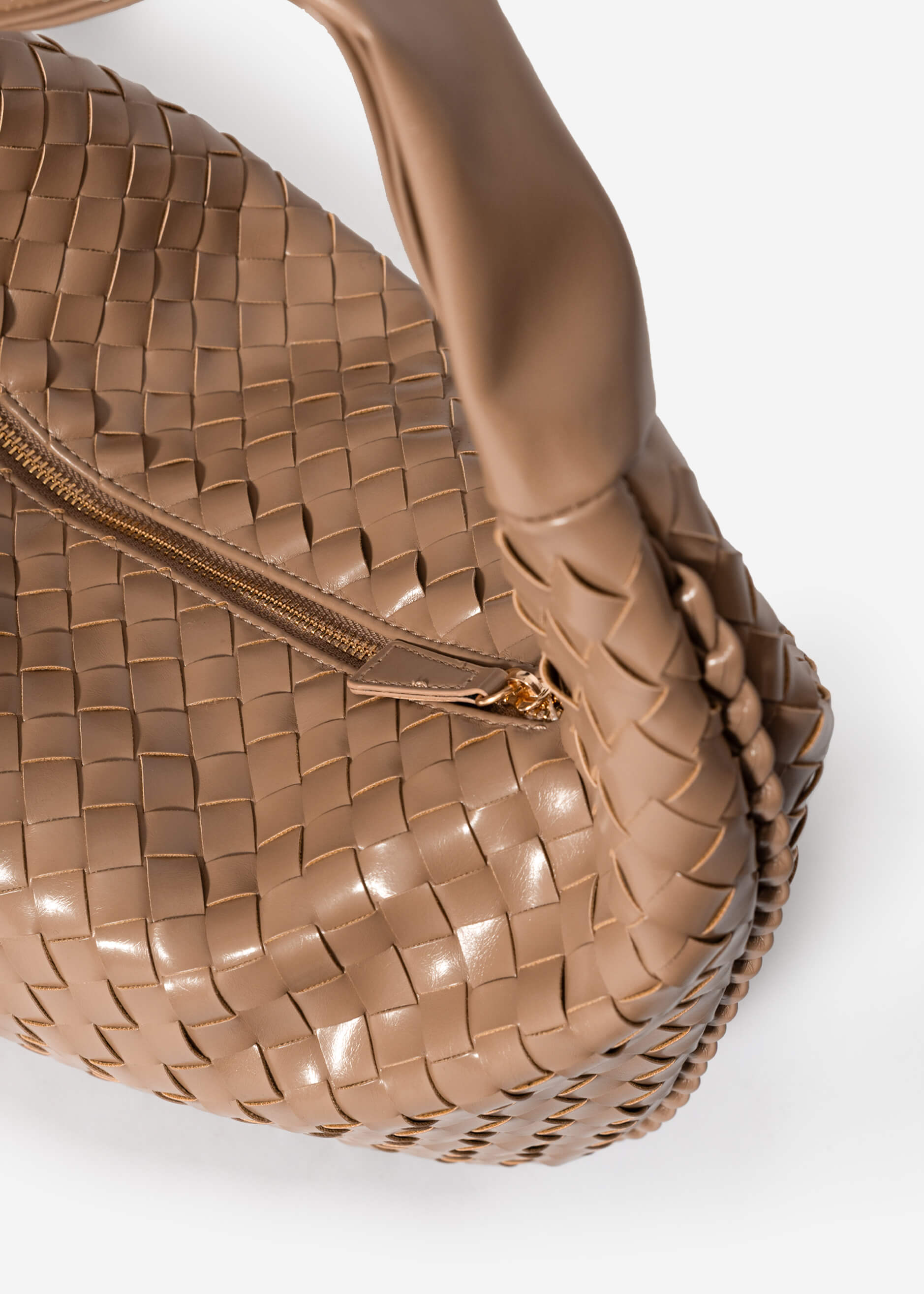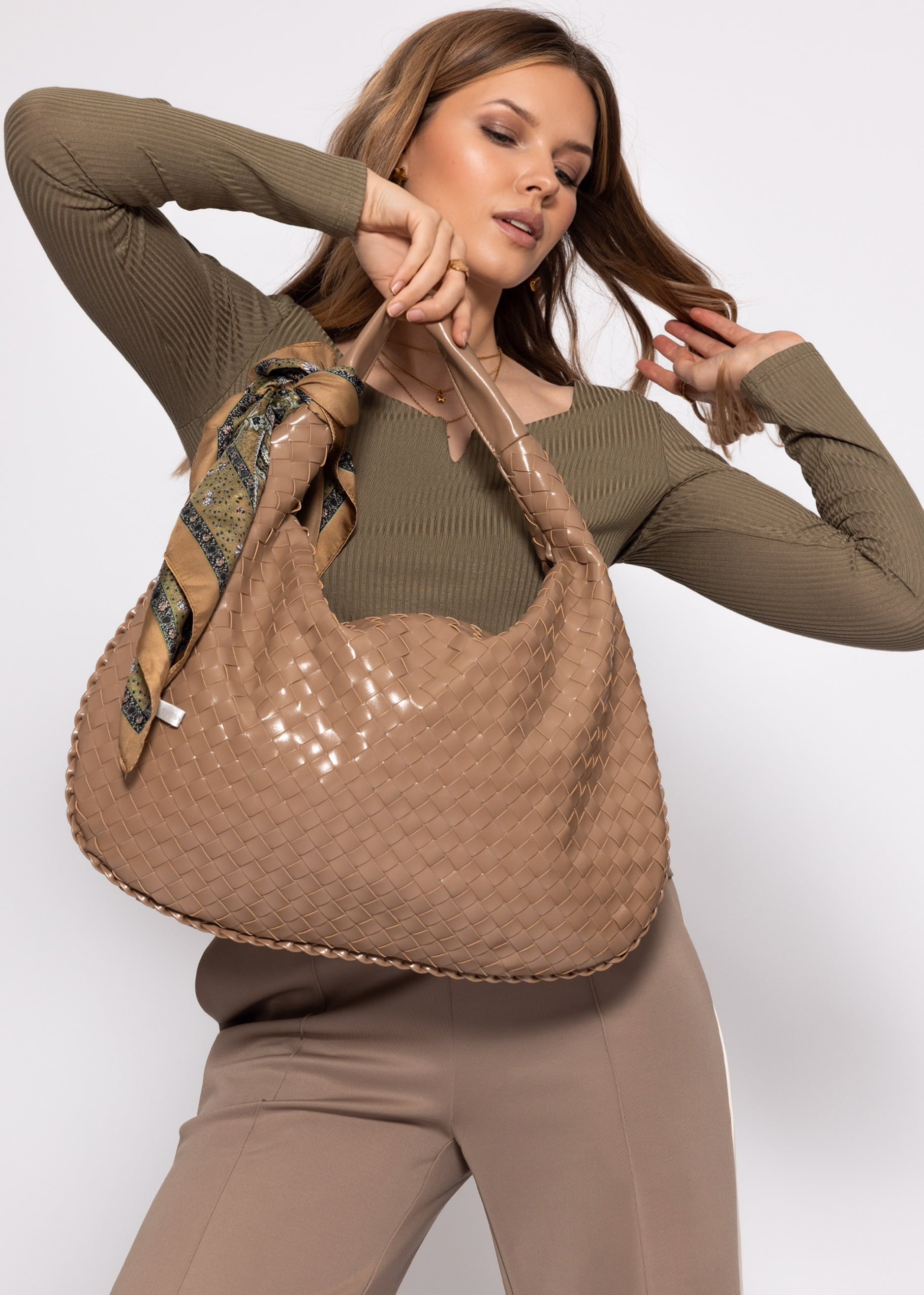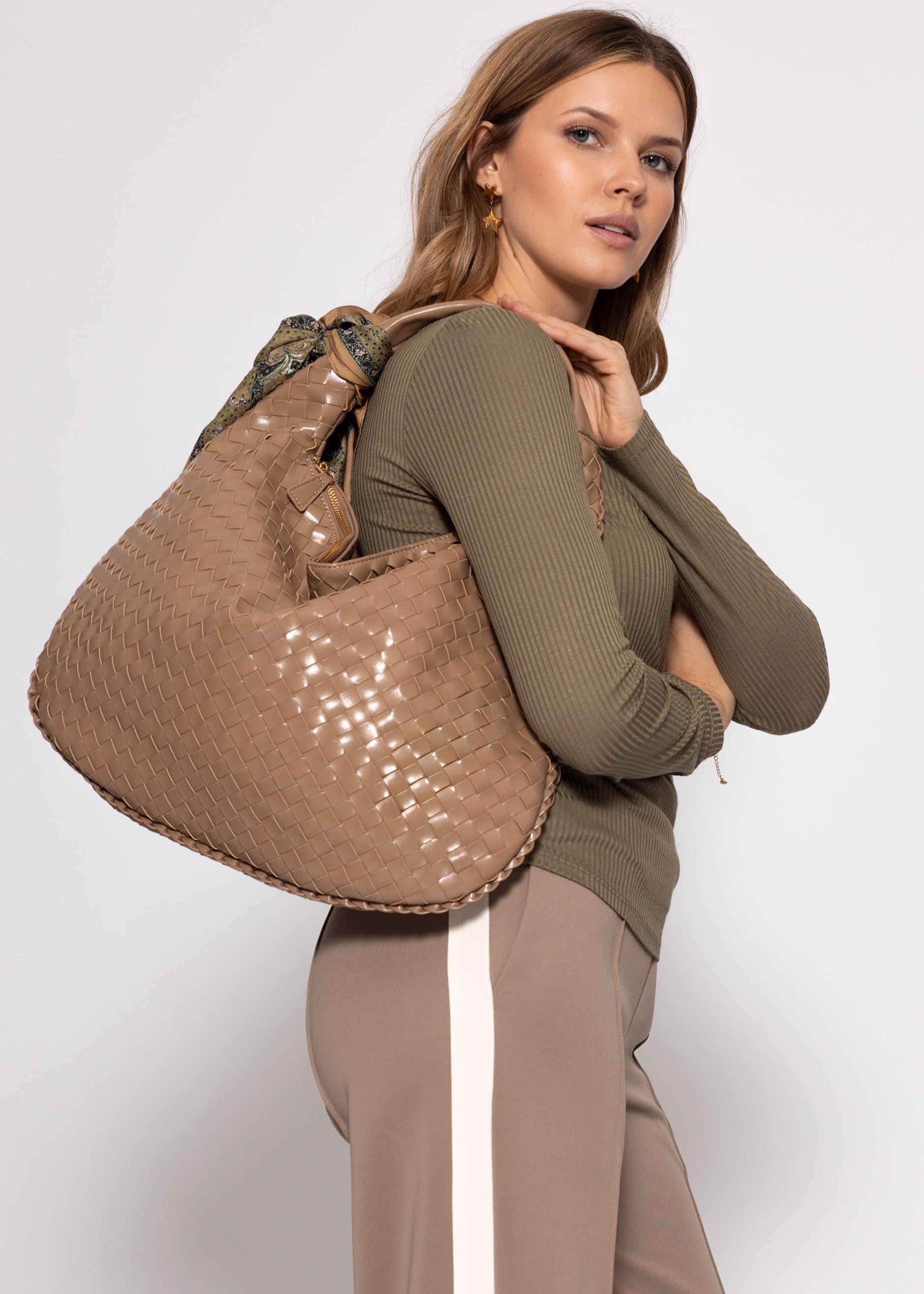 Gewebte Handtasche mit weicher Form und strukturierter Rautenoptik. Dezente goldfarbene Details setzen elegante Akzente. Vielseitig kombinierbar für Alltag und Abendlooks.