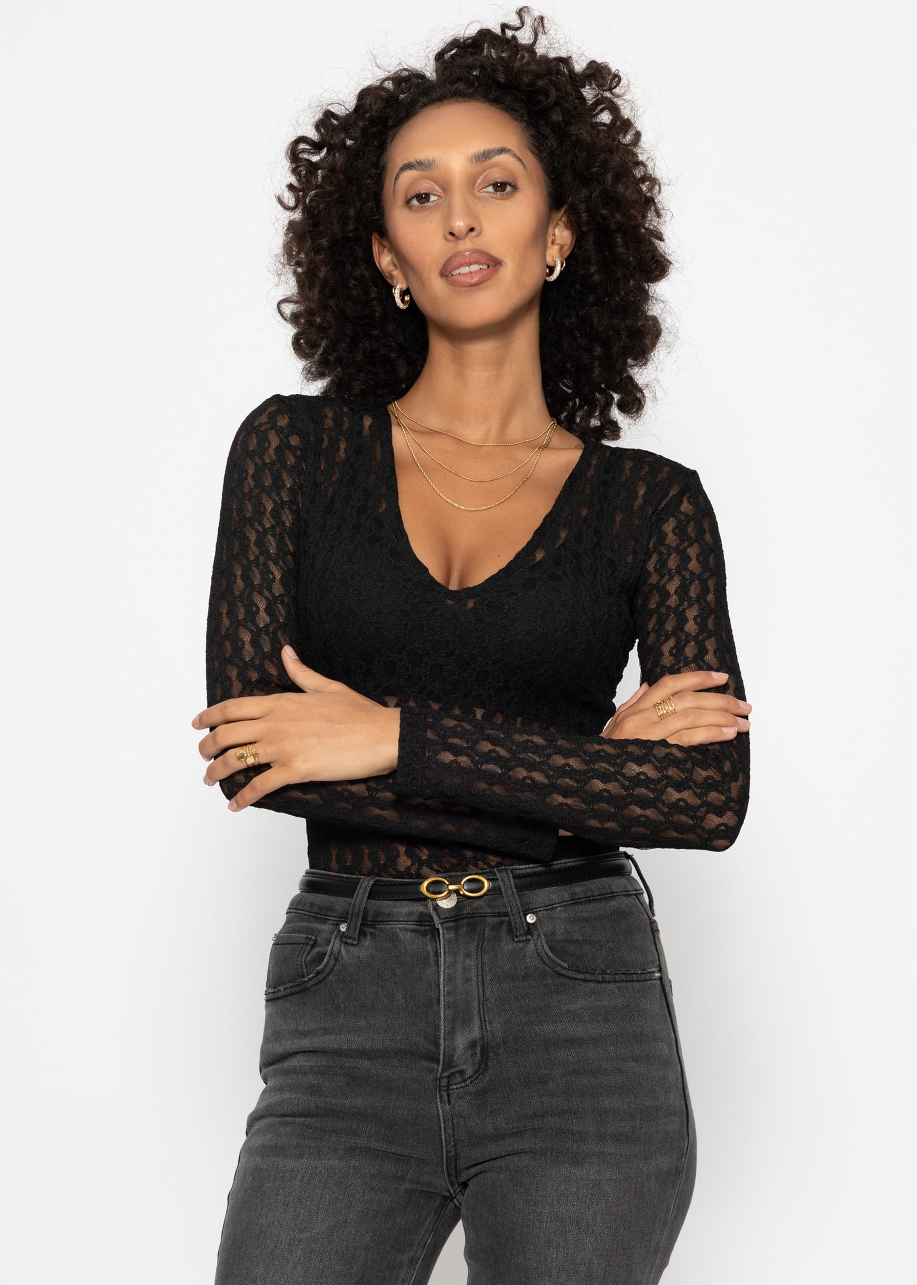 Elegant lace bodysuit that combines feminine charm with a modern, figure-hugging cut. The deep V-neckline skillfully accentuates the décolleté, and the close-fitting design with long sleeves emphasizes the silhouette.