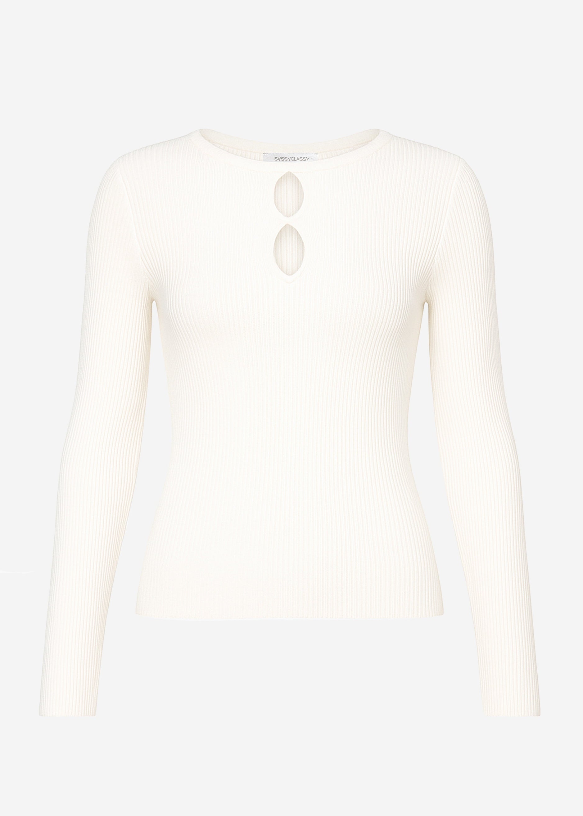 Rippstrick-Longsleeve in Creme mit markantem Cut-out-Detail am Dekolleté. Figurbetonter Schnitt mit rundem Ausschnitt. Ein minimalistisches Design mit modernem Twist – perfekt für vielseitige Everyday-Looks.