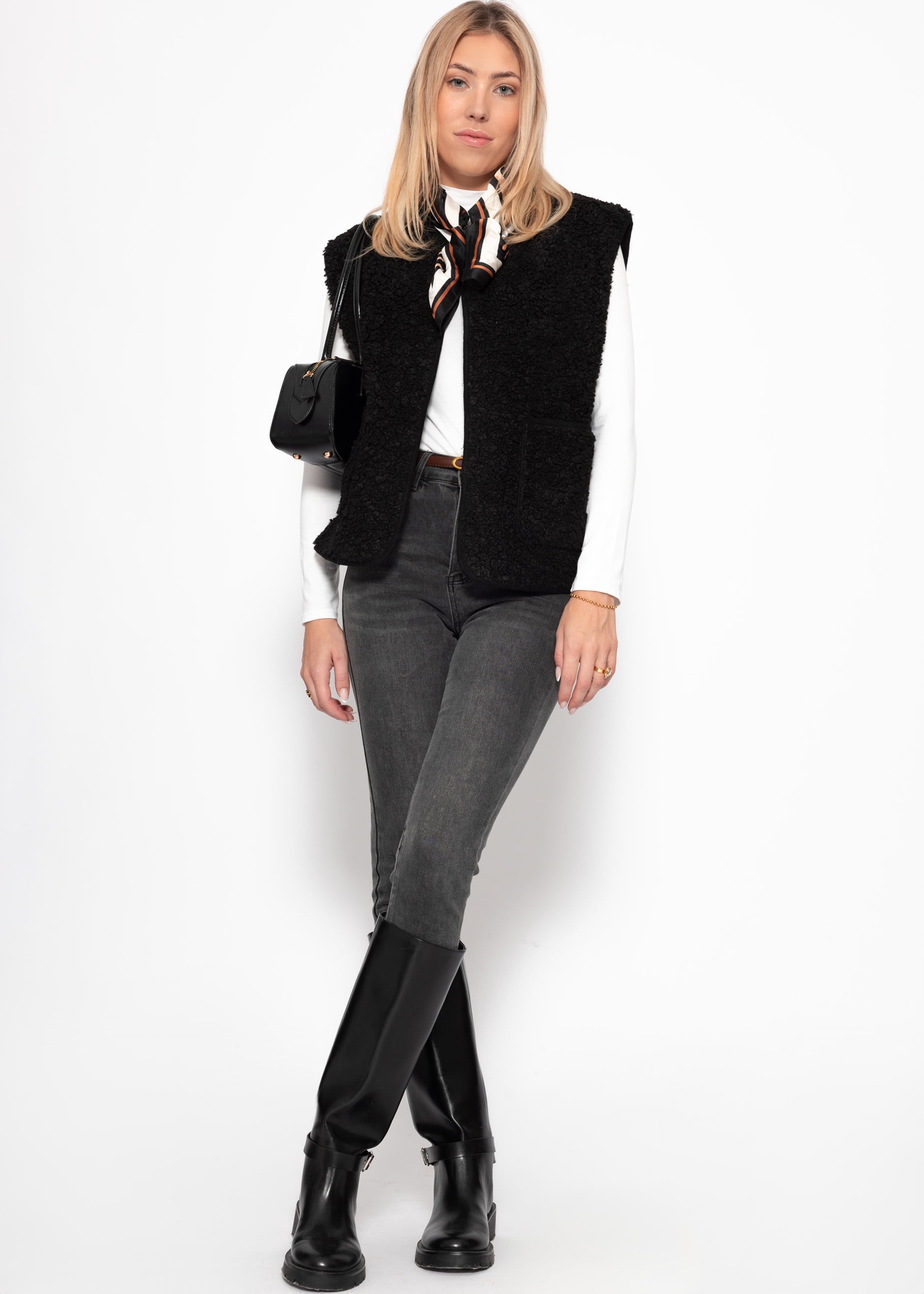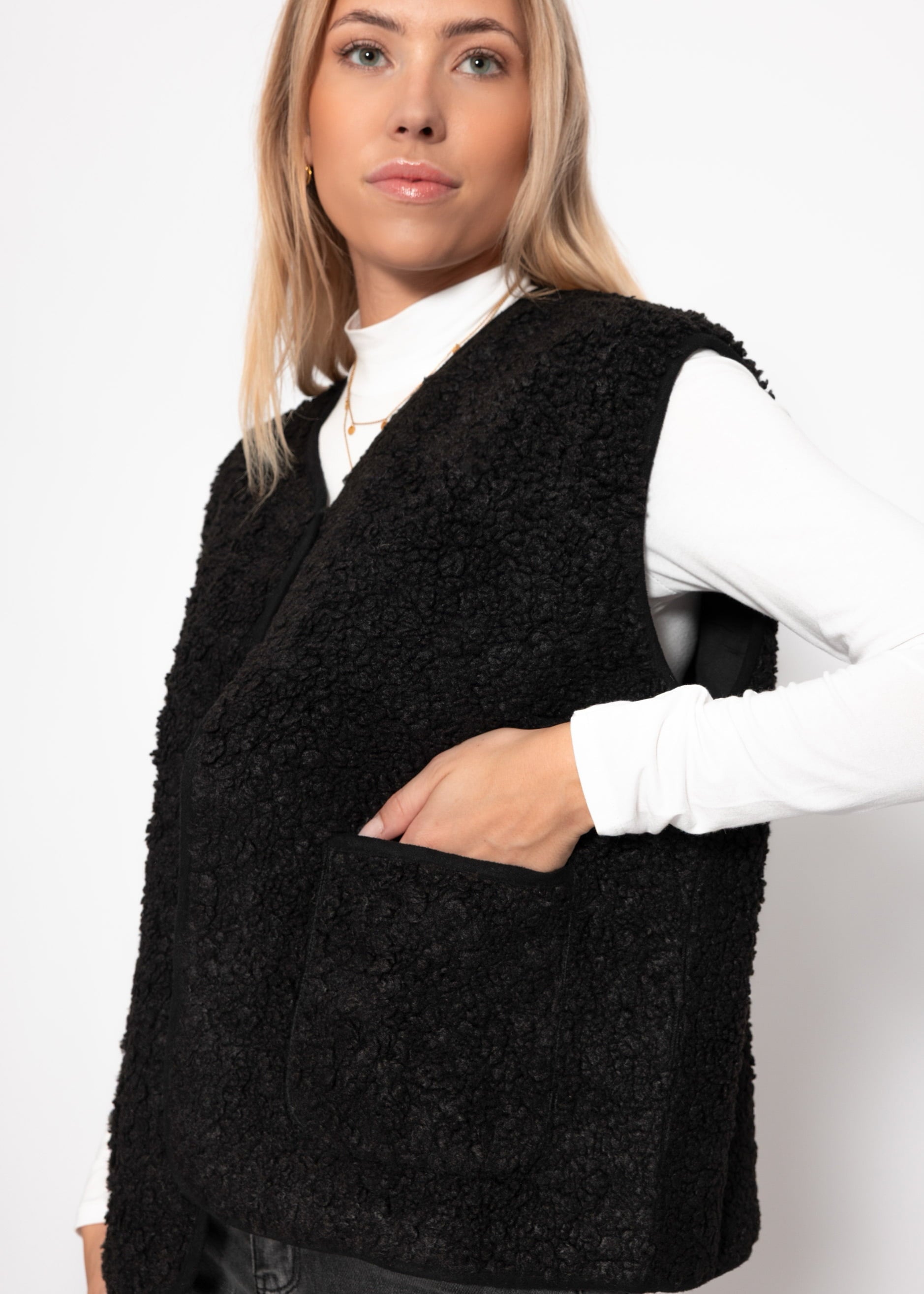 Diese Teddyweste in Schwarz bietet ein angenehmes Tragegefühl und hält an kühleren Tagen warm. Sie besitzt lässige Eingriffstaschen.