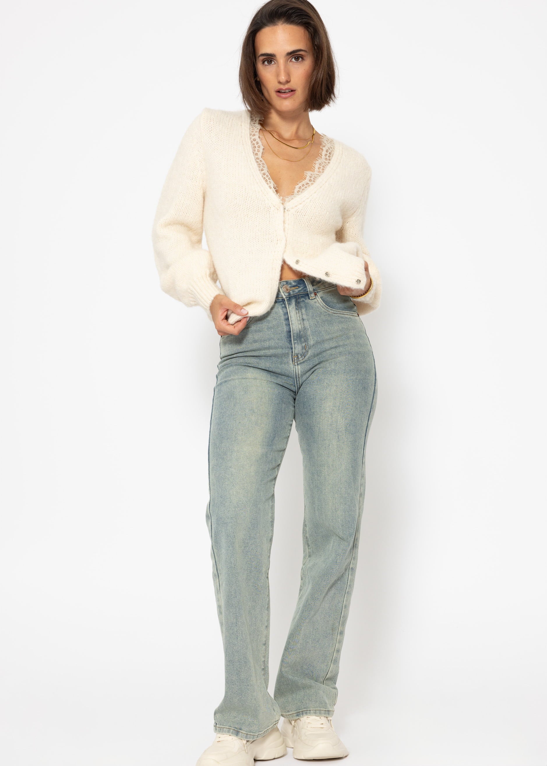 If you're looking for a timelessly beautiful cardigan, this is the ideal choice. The traditional V-neckline of the cardigan is adorned with delicate lace, giving the garment a feminine and romantic touch. This sophisticated combination between the chunky knit and the delicate elegance of the lace gives the cardigan a unique look. With its generous fit and dropped shoulders, the cardigan creates a modern silhouette that is both casual and stylish. The press studs make it easy to open and close the cardigan.
