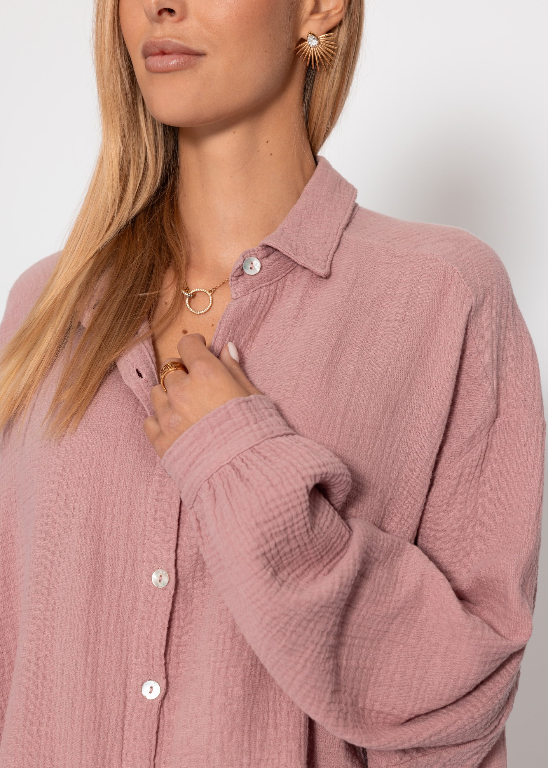 Casual blouse shirt made of soft cotton fabric with mother-of-pearl buttons. The ultra oversized cut and horizontal pleat at the back give it a casual look. The collar, button fastening and cuffs on the long sleeves add an elegant touch. This blouse is now also available here in a shorter version. Recommended up to size 48