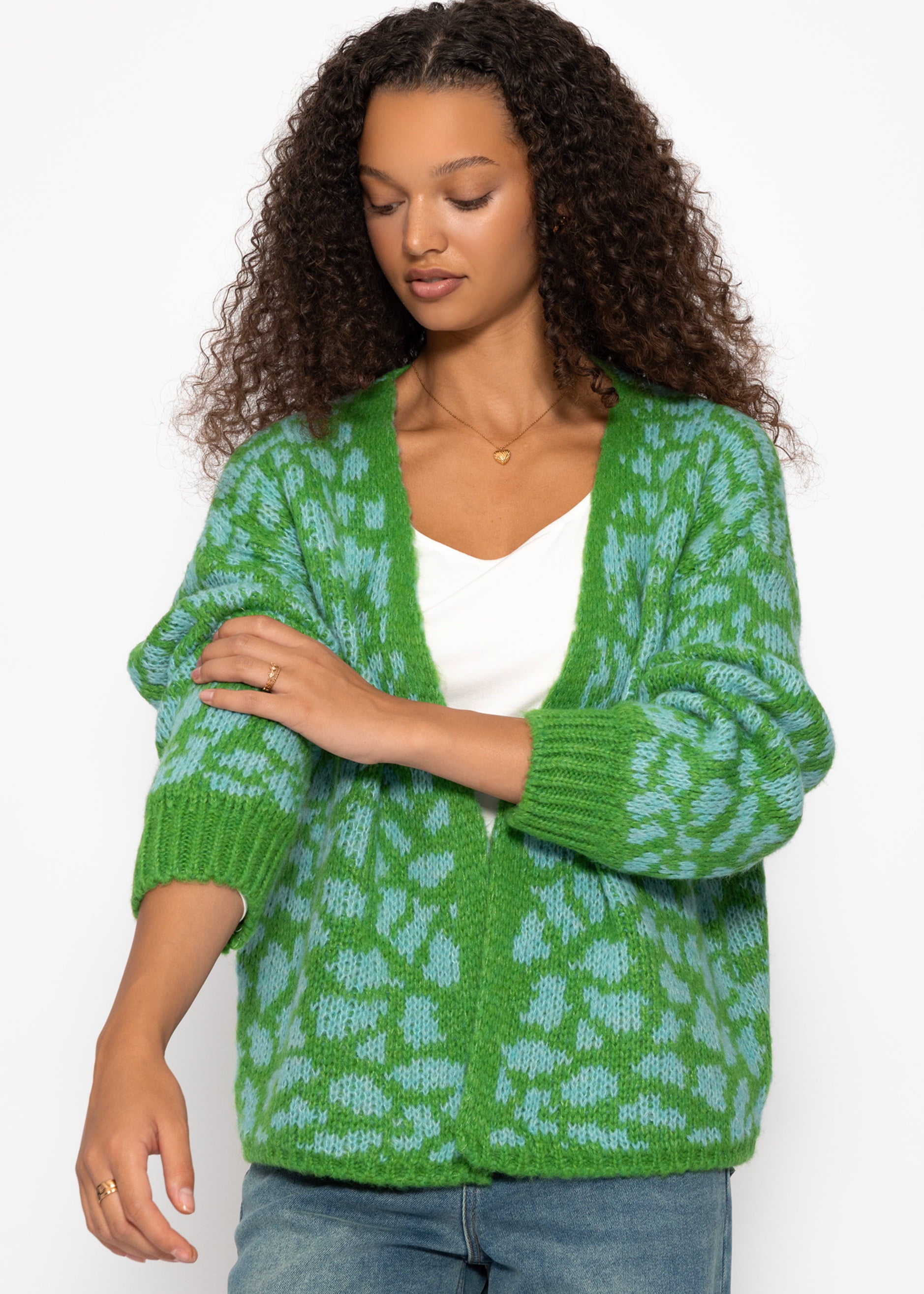 This cropped cardigan in soft knit fabric features an eye-catching leopard print in green and blue – a real statement piece for trend-conscious looks. The casual, slightly oversized cut ensures a modern fit and high wearing comfort. Soft ribbed cuffs and an open front round off the design, making this knit cardigan the perfect companion for relaxed everyday outfits. Whether worn with jeans and a basic shirt or over a dress, this leopard print knit cardigan adds a splash of color and gives every look that certain something.