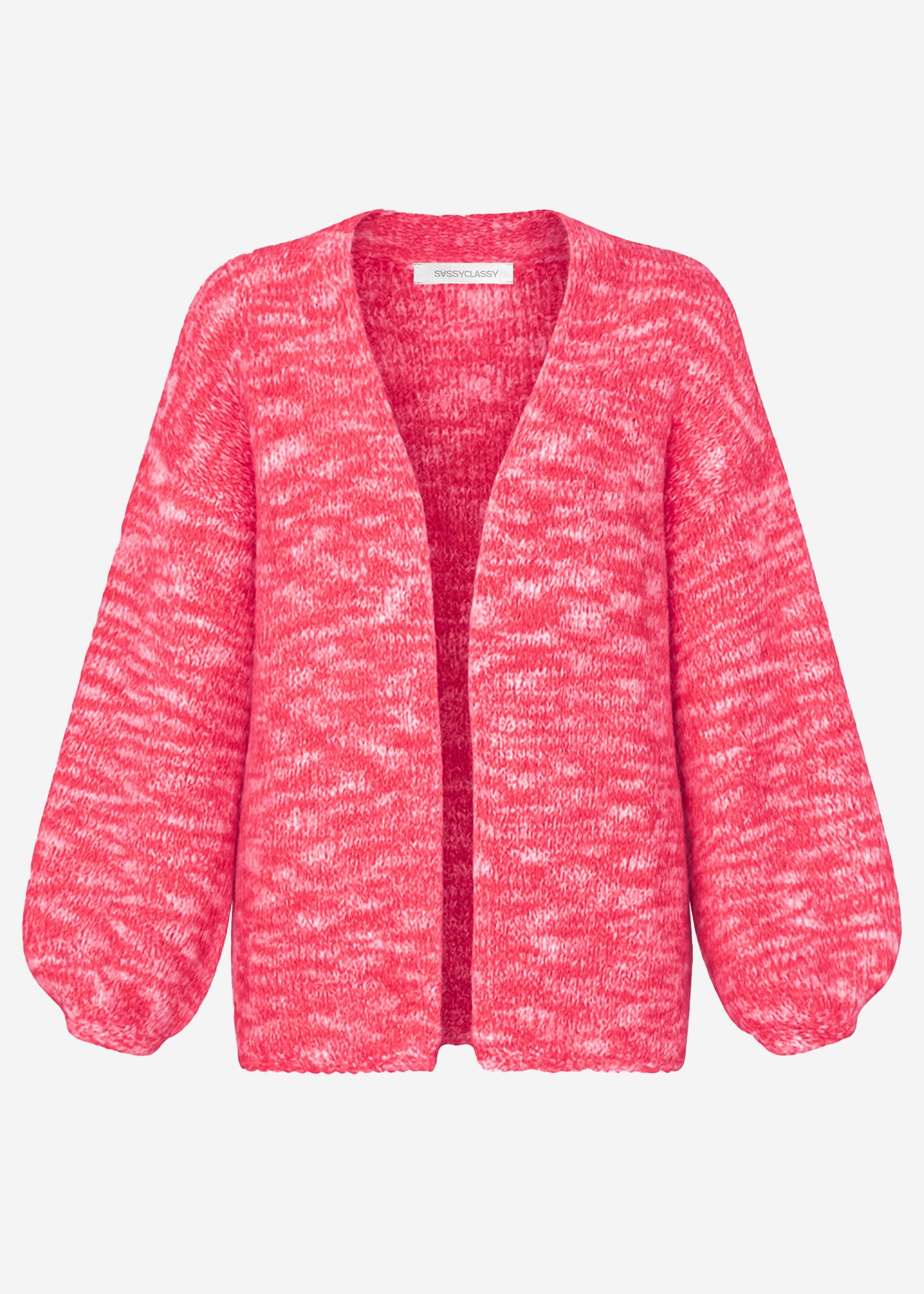 Offener Cardigan im pink-weißen Melange-Muster mit softer, flauschiger Struktur. Lockerer Schnitt mit weiten Ärmeln für einen gemütlichen, lässigen Look. Perfekt für frische Farbakzente im Alltag.