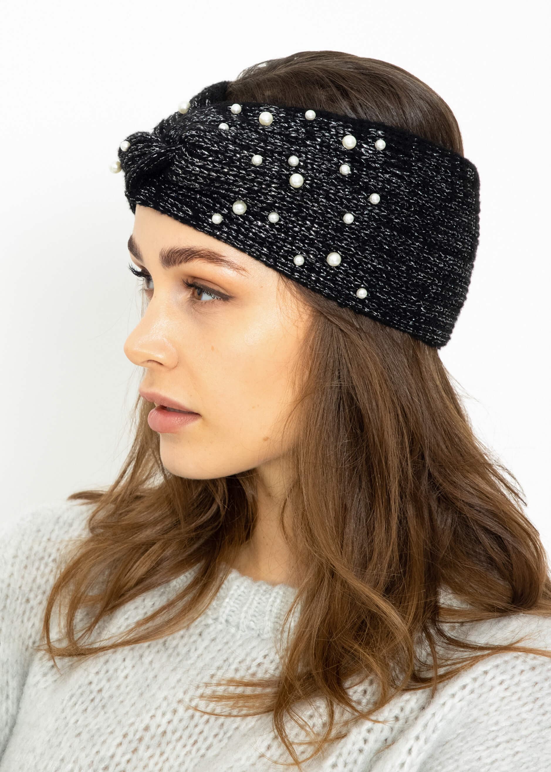 Knitted headband with pearls and lurex in black