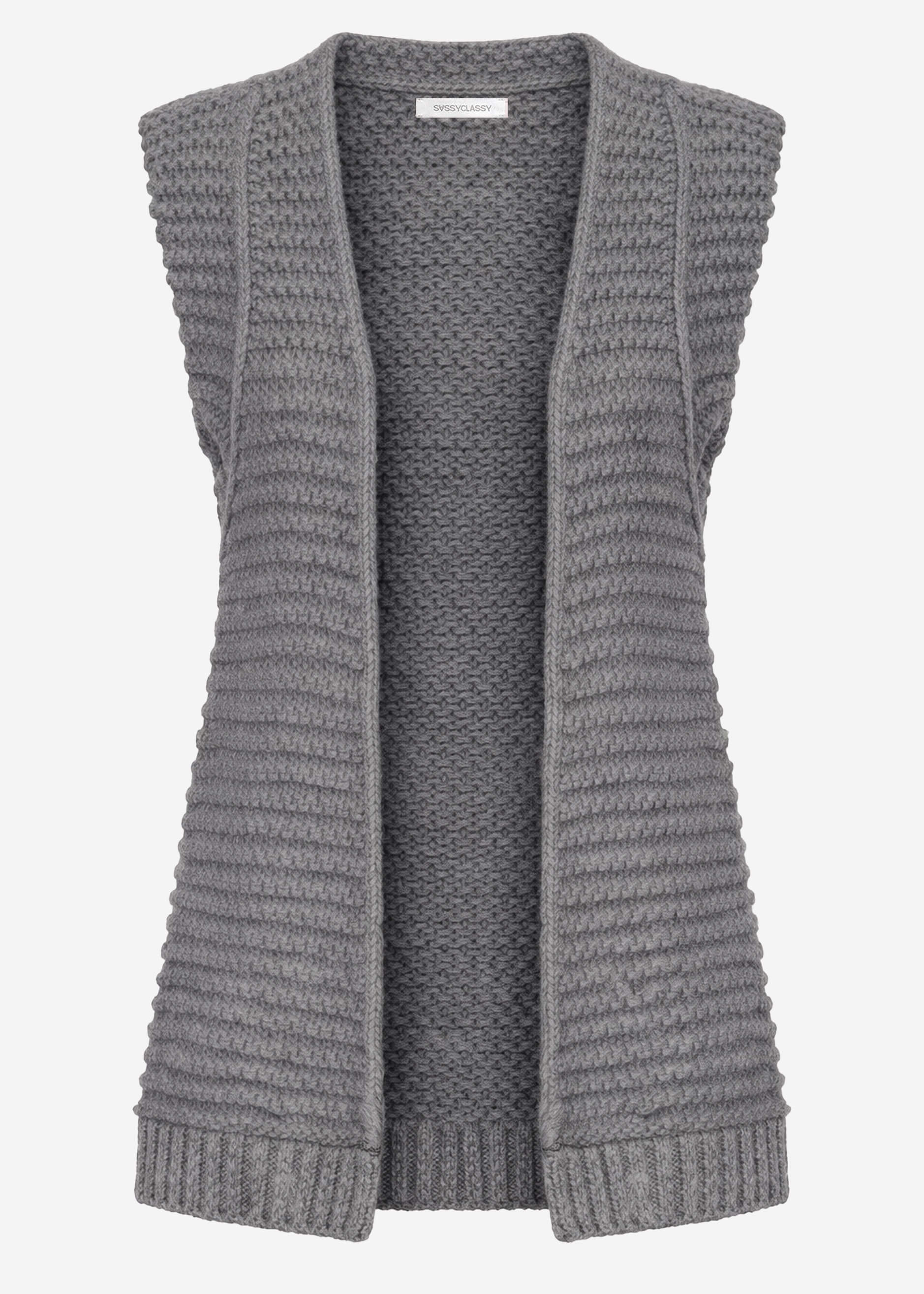 Long sleeveless knitted vest with structured shoulders in grey