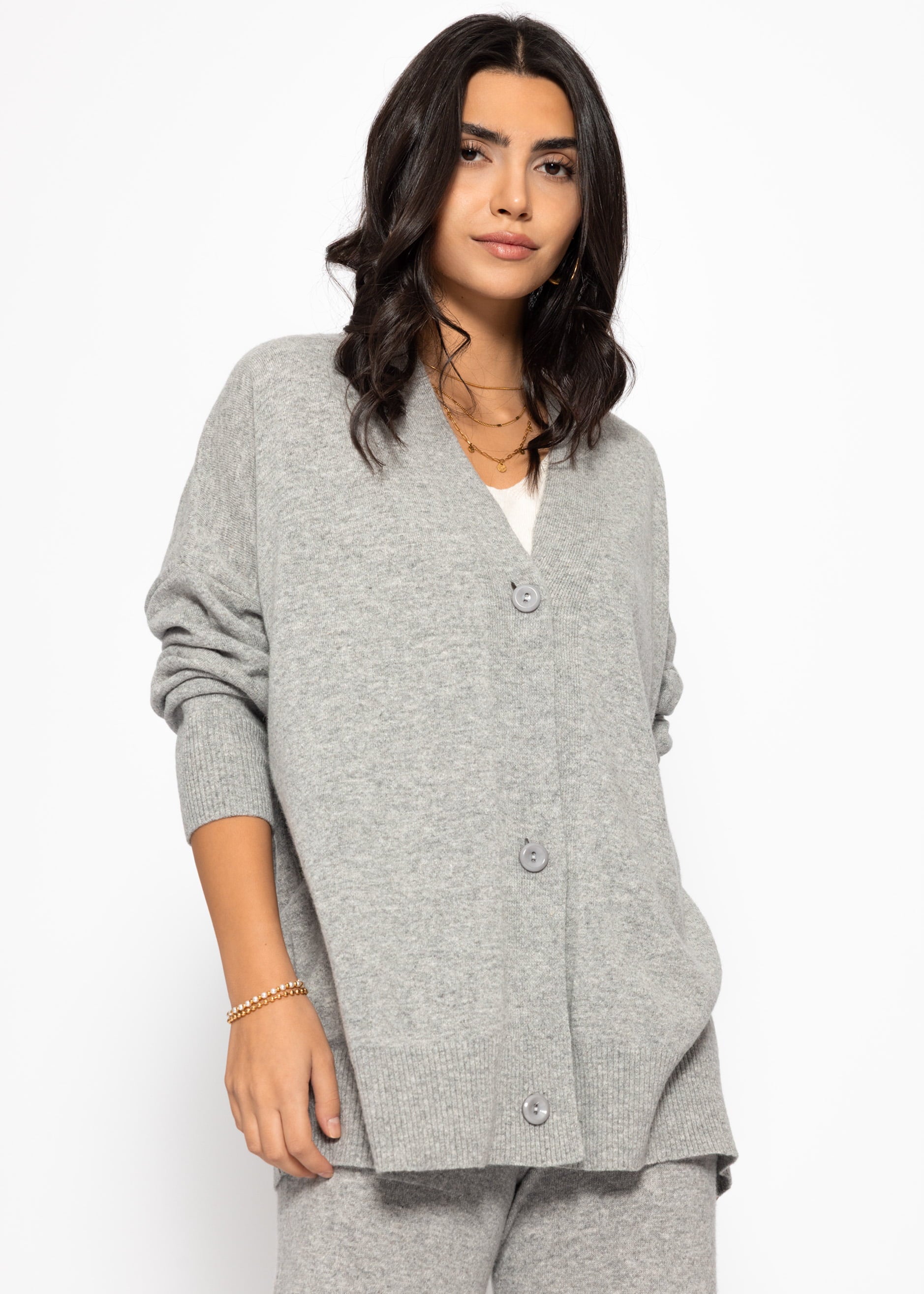 This oversized cardigan combines casual elegance with luxurious comfort. The high-quality knitted material with cashmere content feels particularly soft against the skin and ensures a pleasant feeling of warmth. Thanks to its loose fit, dropped shoulders and deep V-neckline, it has a modern and relaxed look, while the large buttons add a classic touch. Wide ribbed cuffs and hem provide additional structure. This cardigan is versatile and can be worn perfectly with the matching trousers in the same material and color to create a stylish ensemble.