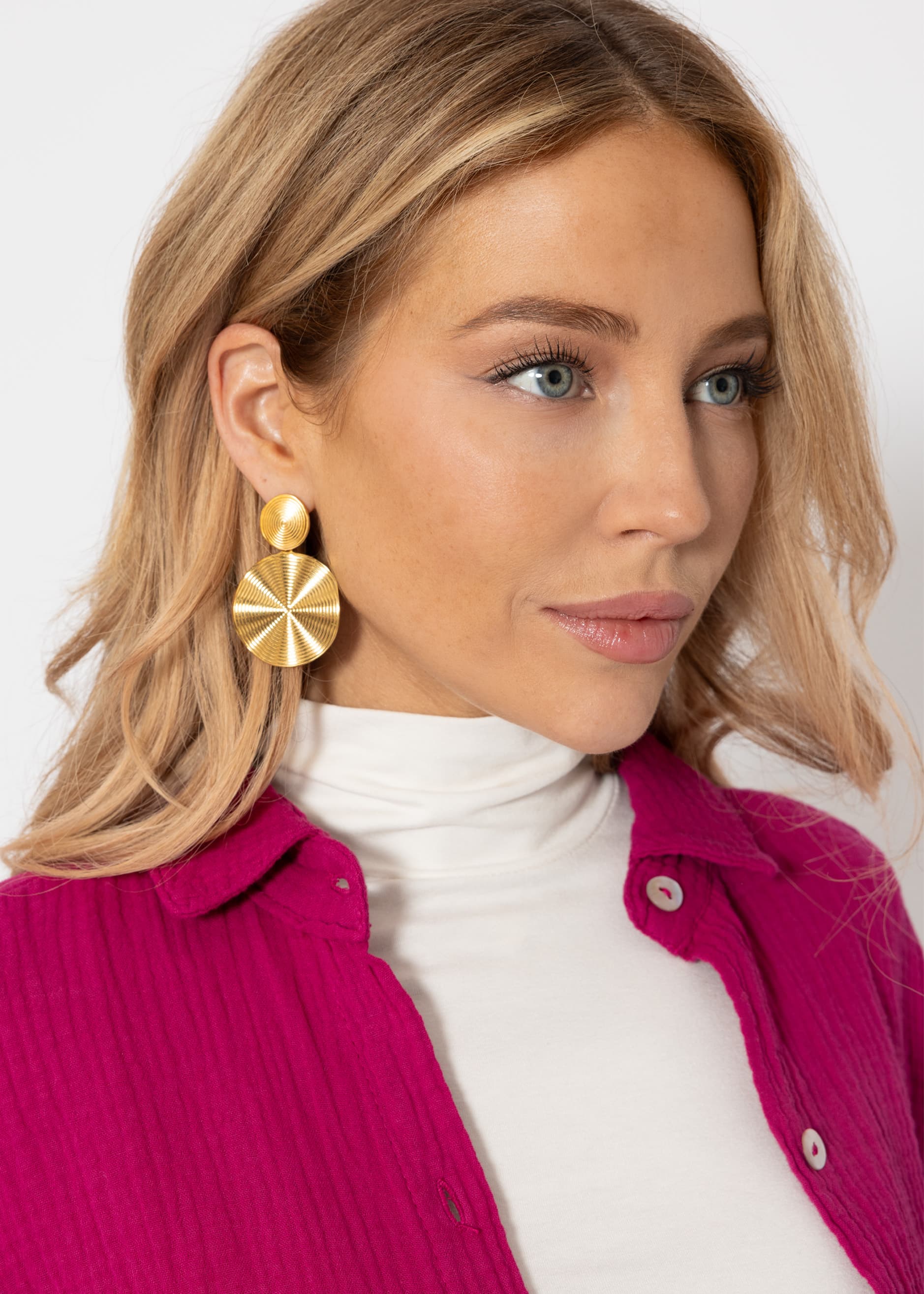 These earrings are characterized by a delicate spiral pattern that gently transitions into a generously sized circle. The precise design of the grooves catches the light in a special way, while the wavy structure of the earrings creates a fascinating depth. The ear studs are a versatile companion that add sparkle during the day as well as enhancing evening ensembles.