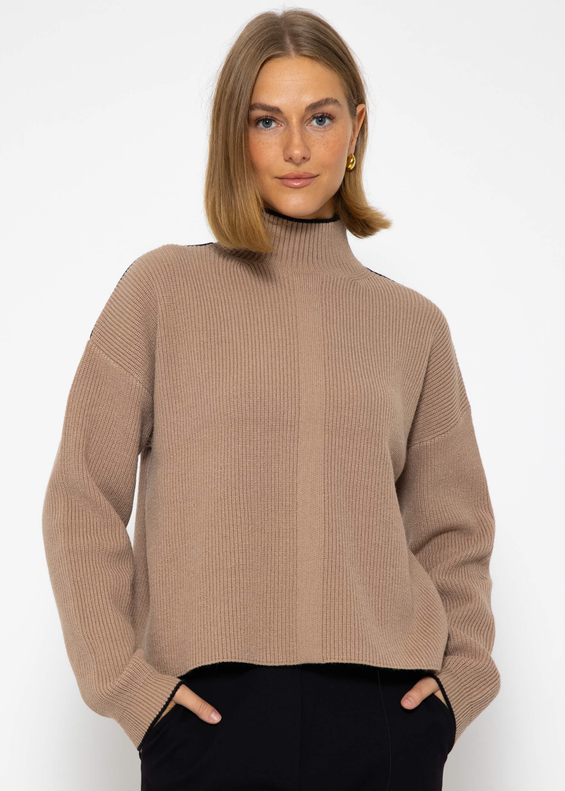 Experience ultimate comfort and contemporary style with this fashionable knit sweater. With its generous, loose fit, it offers a trendy look and exceptional comfort. The turtleneck adds a touch of elegance and keeps you warm on cooler days. The model features long sleeves, ribbed trims, and dropped shoulders. The highlight of the sweater are the colorful accents on the cuffs, collar, and shoulder area, which add a trendy touch and set it apart from conventional knit sweaters.