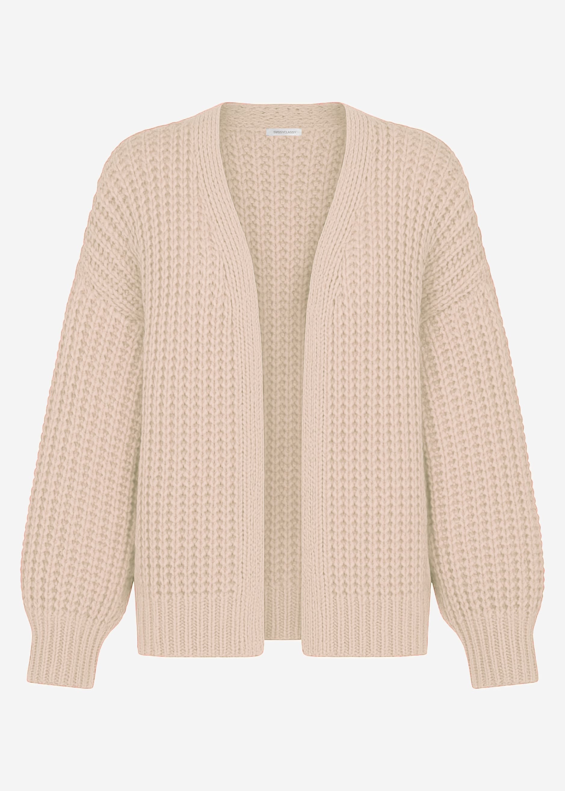 This openwork chunky knit cardigan is a cosy all-rounder for every season. The loose, slightly oversized silhouette with dropped shoulders flatters the figure, while the wide collar drapes softly. The striking, voluminous knit gives the cardigan structure and a modern, casual look. The wide ribbed cuffs keep their shape and ensure a neat appearance. As it is designed without a fastening, it can be thrown on effortlessly. It is made for countless favourite looks.