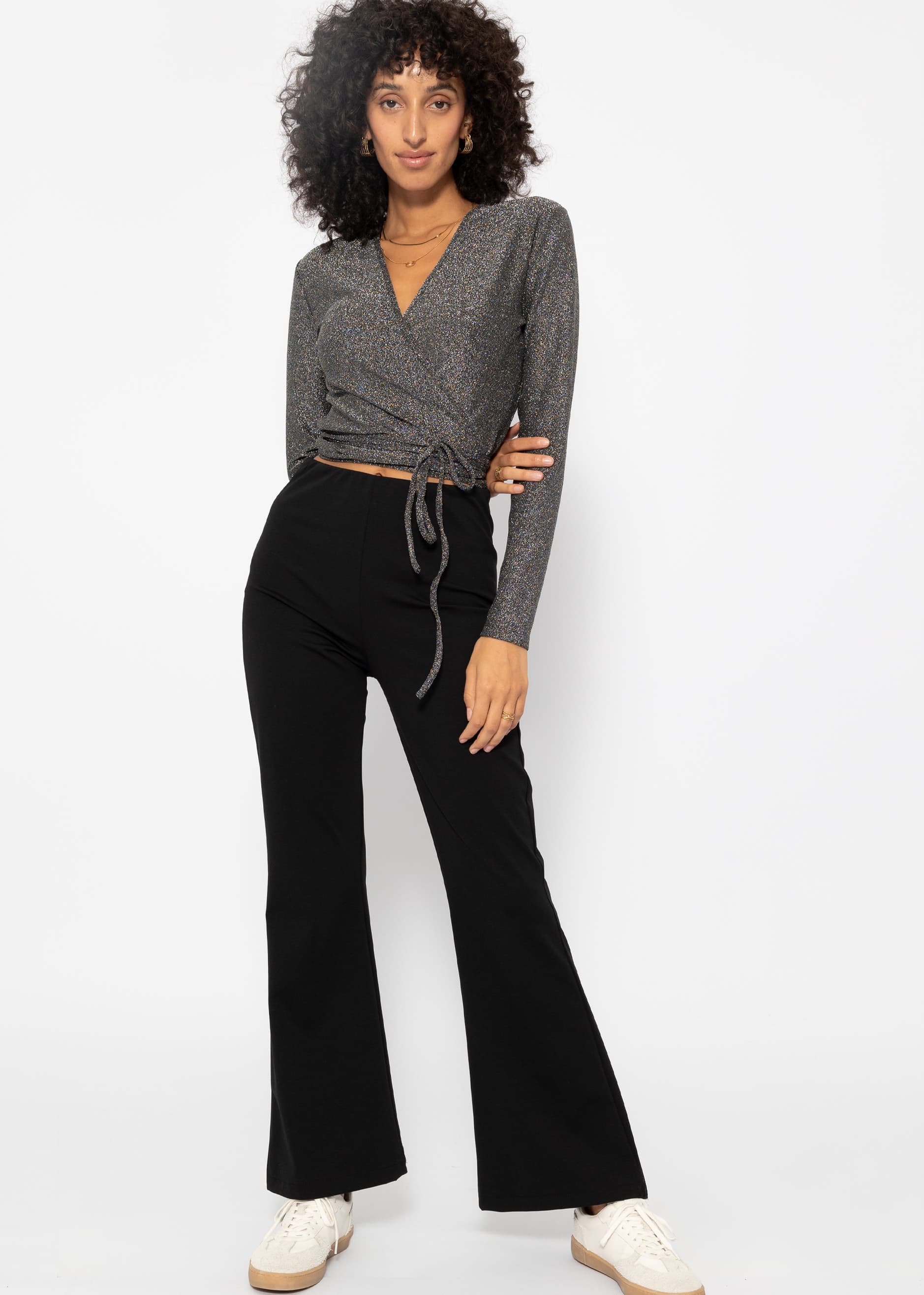 This wrap shirt is a sparkling addition to your wardrobe. It features a slim fit, long sleeves, and a V-neck. The highlight of the shirt is the glittering lurex effect, which shimmers strikingly and catches the light, adding a touch of glamour to any occasion. The wrap shirt has a sewn-in tie that you can customize.