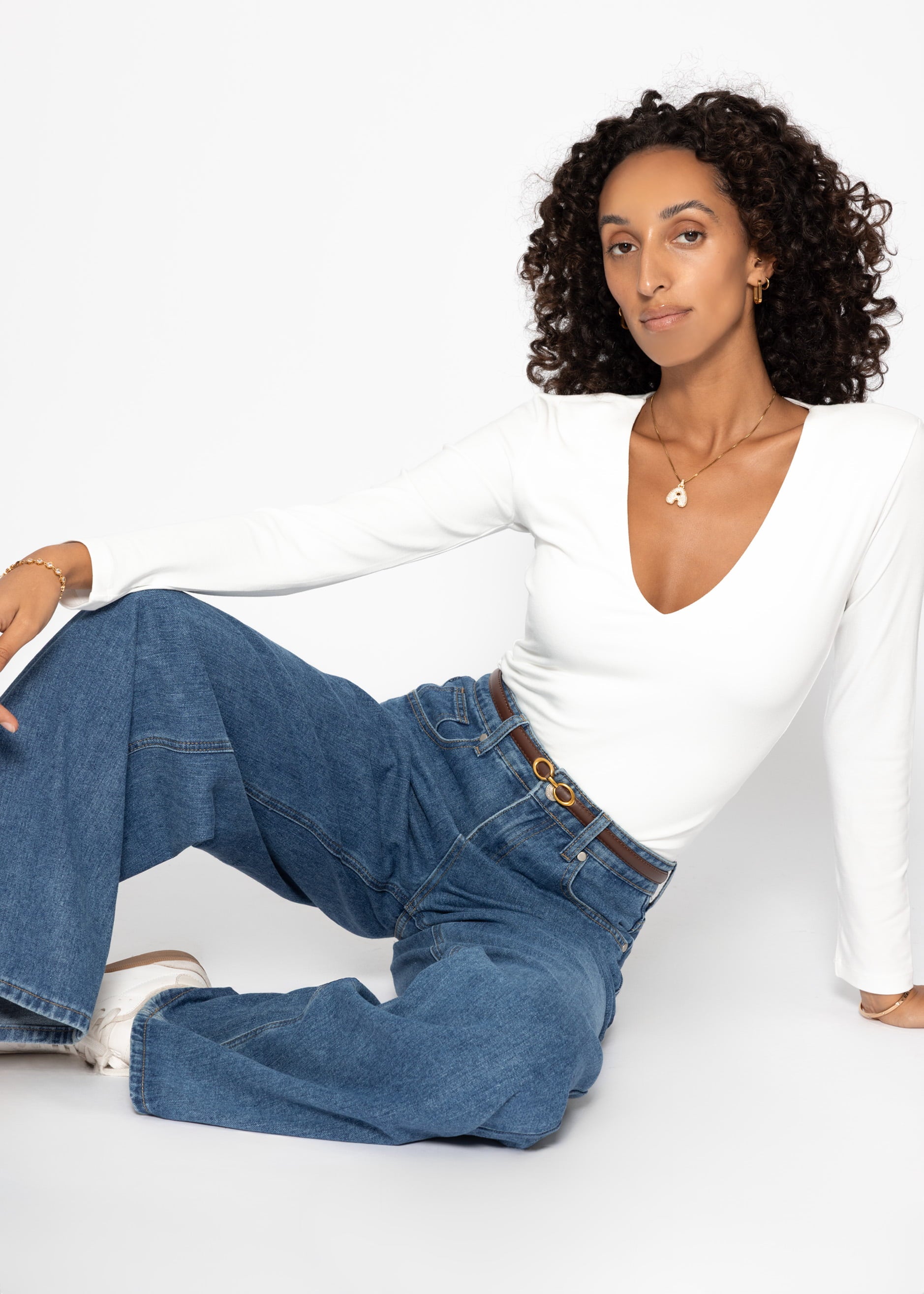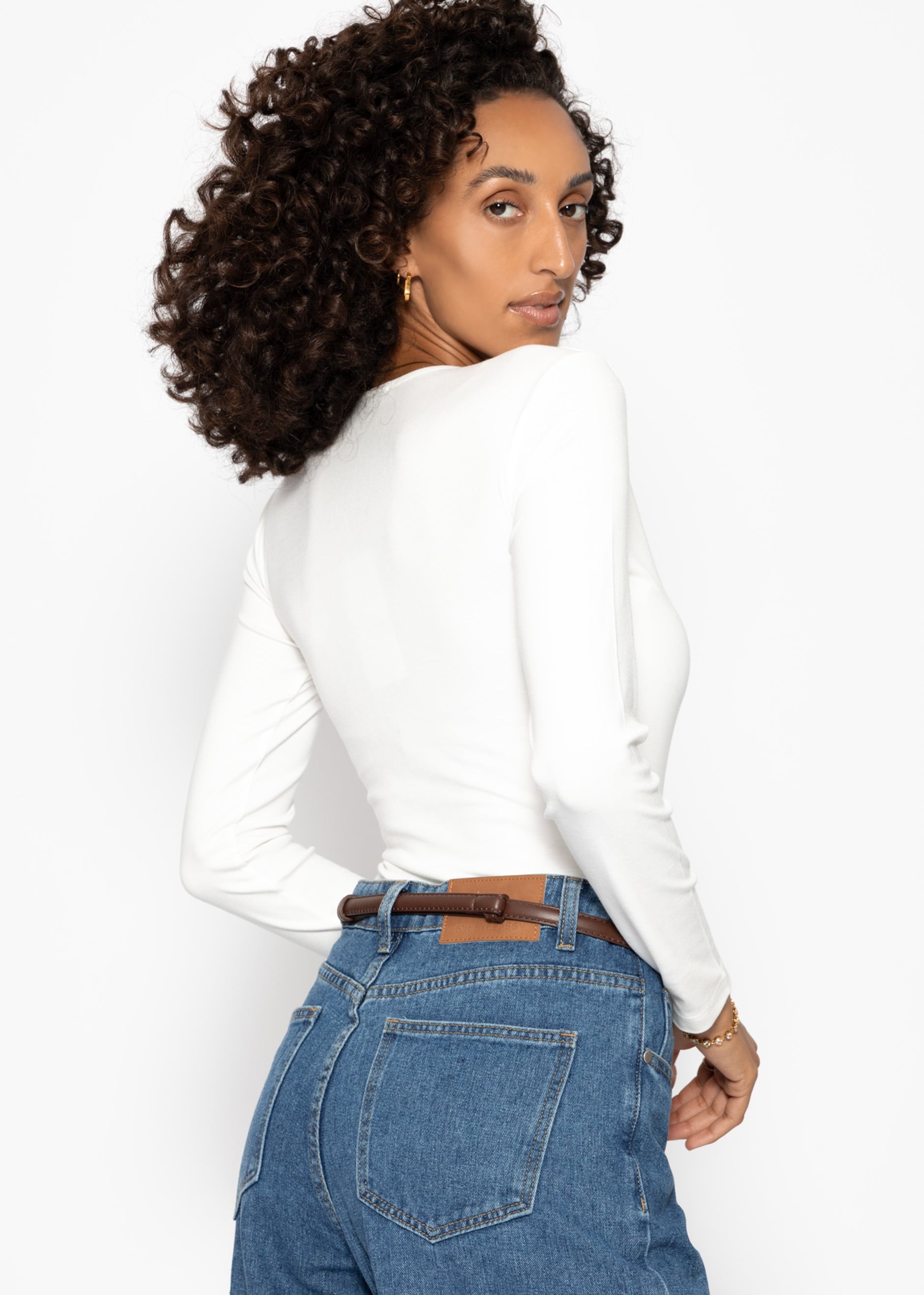 This long-sleeved body combines simplicity with elegant sophistication. The deep V-neck sets a feminine highlight and discreetly emphasizes the cleavage, while the long sleeves provide a modern, clean look. Thanks to the cuddly fit, the body sits perfectly all day - no slipping, no plucking. The soft, elastic fabric ensures a comfortable fit and makes it the ideal basic for versatile outfits - whether with jeans, skirts or under the blazer.