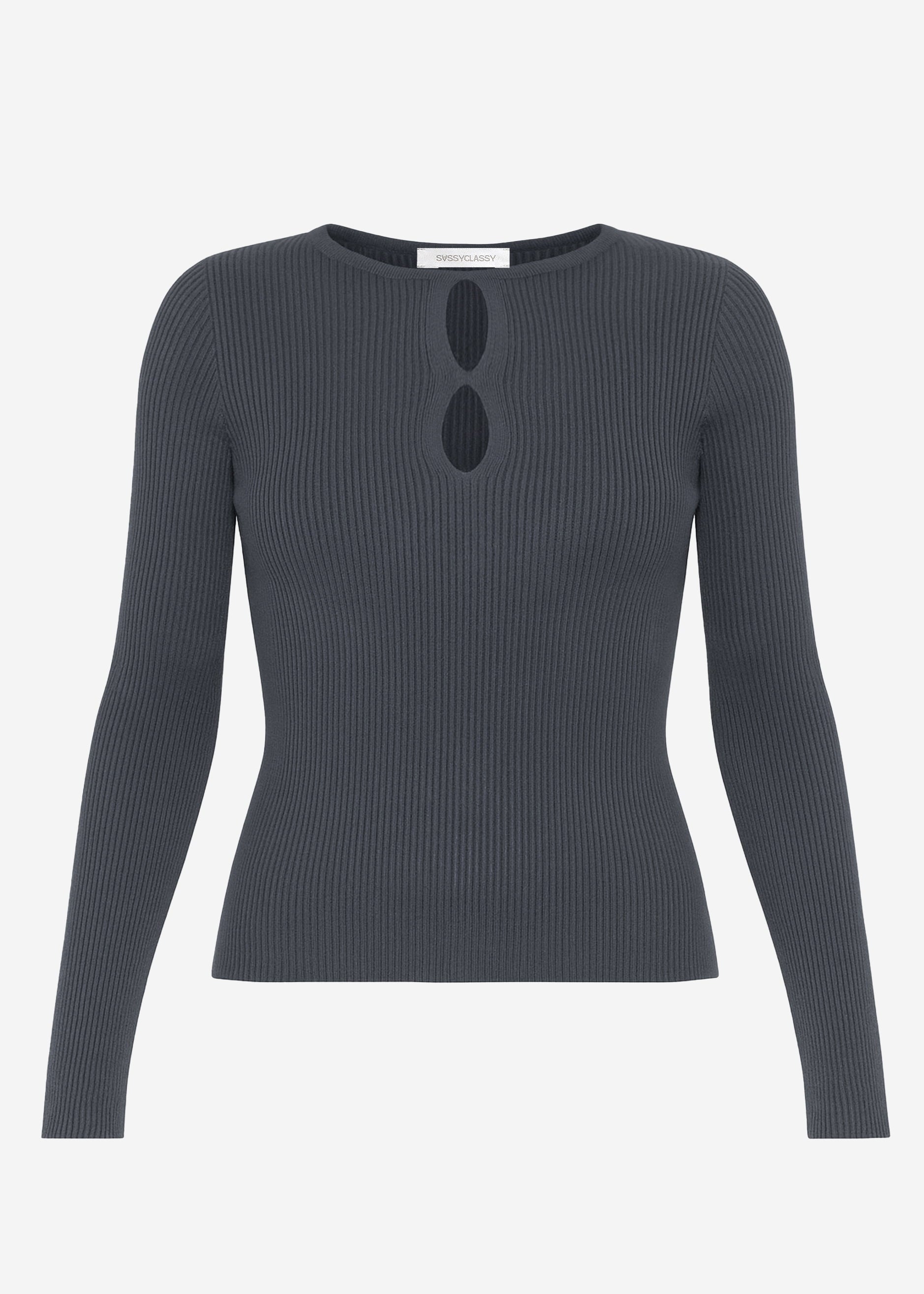 Ribbed knit long-sleeved top in gray with striking cut-out detail at the neckline. Figure-hugging cut with round neckline. A minimalist design with a modern twist—perfect for versatile everyday looks.
