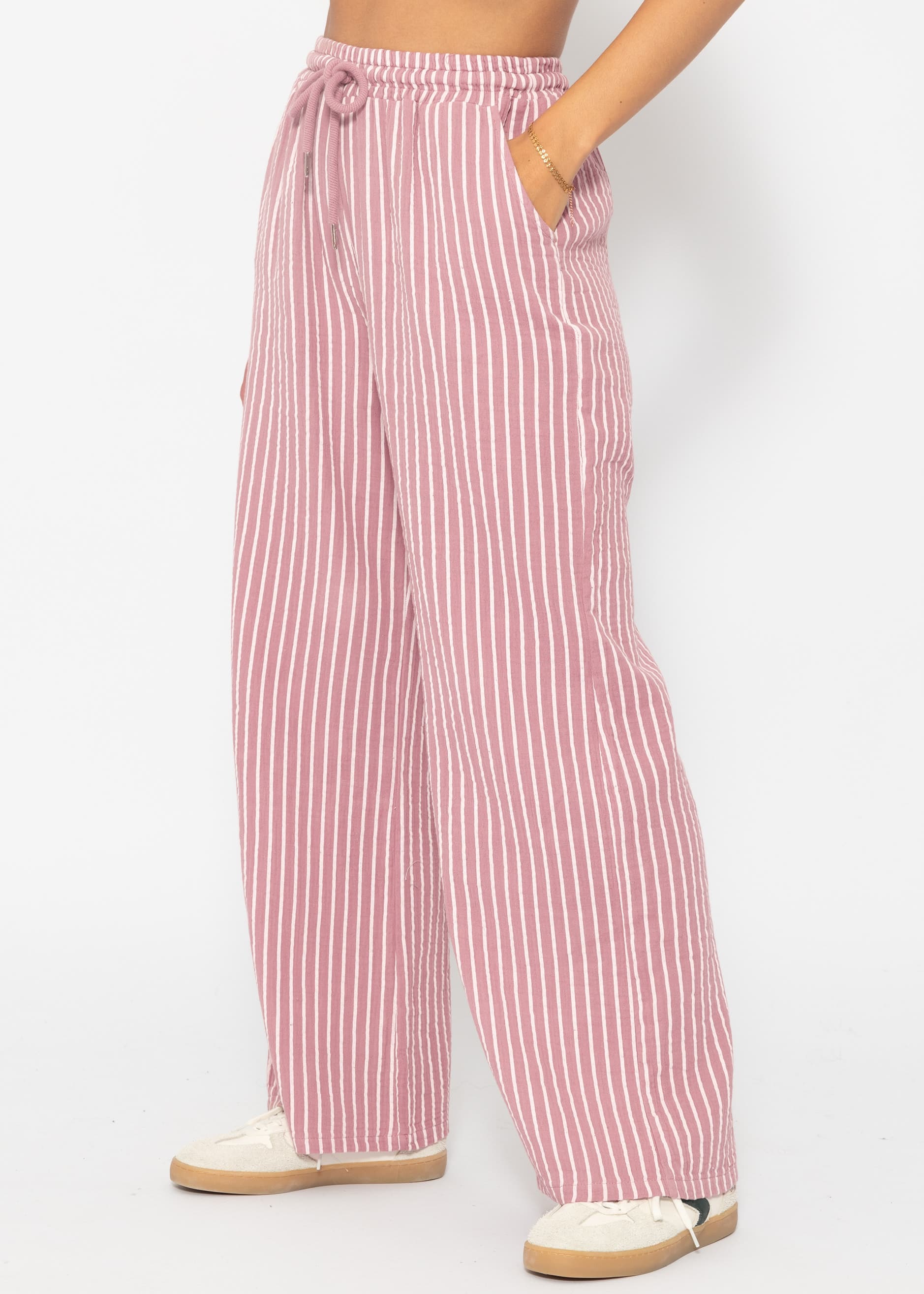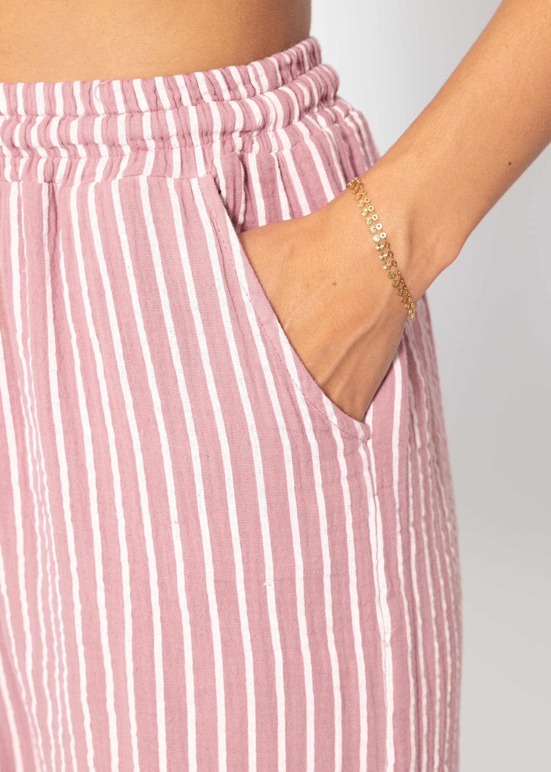 These muslin pants are the ideal choice for relaxed days and casual outfits. The model features a loose fit and a high, elastic waistband with a tie for a custom fit. Side pockets provide space for small everyday items. Crafted from pure cotton, these wide-leg pants offer optimal comfort. The striped print gives the pants a nautical look and makes them a real eye-catcher.