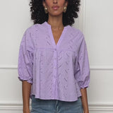 This lilac -colored blouse made of fine hole tip brings romantic details into a cool silhouette. The loose cut with the balloon sleeves and elastic degrees meets a feminine V -neck and a cropped length - perfectly with high -wawish pants. The soft cotton fabric ensures a comfortable fit and the continuous button placket and branded SassyClassy buttons complete the design stylishly.