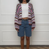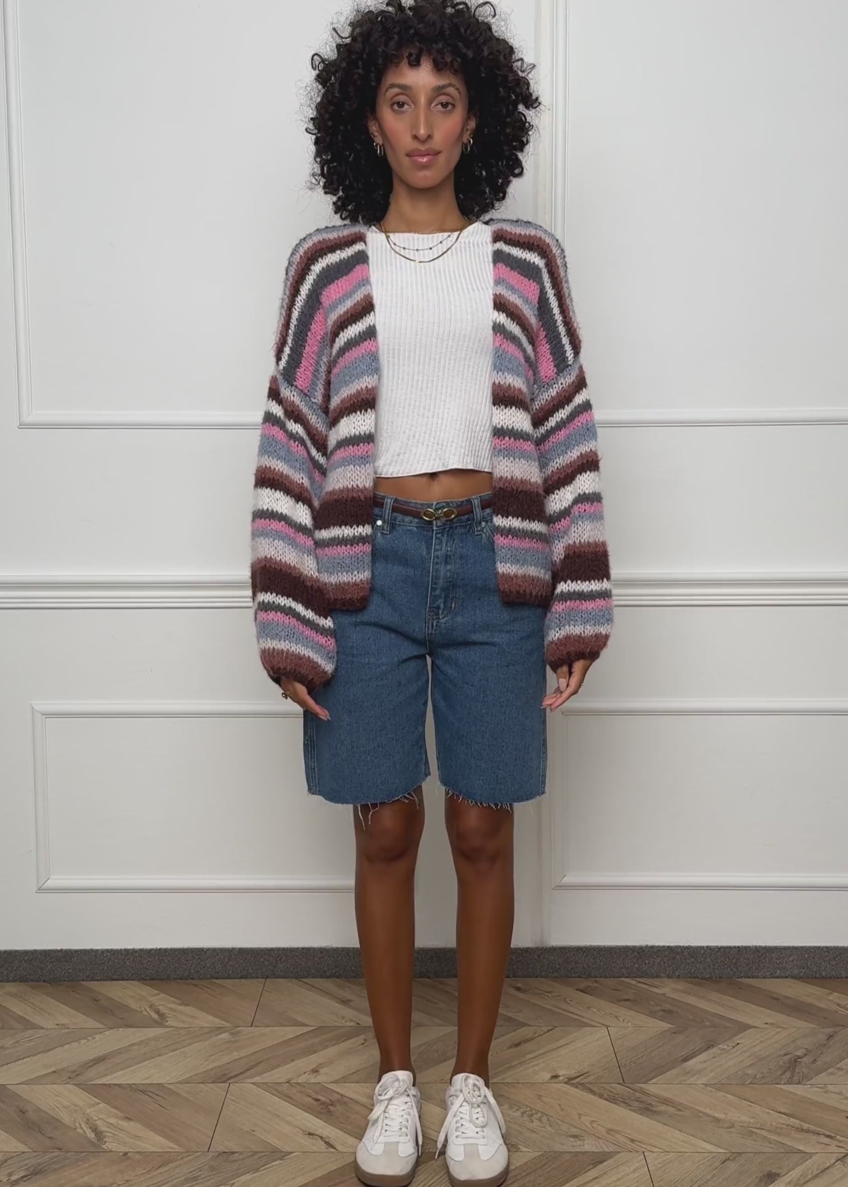 Dieser weiche Strickcardigan in Braun hat ein markantes Streifenmuster. Er besitzt voluminöse Ärmel und einen offenen Frontschnitt.
