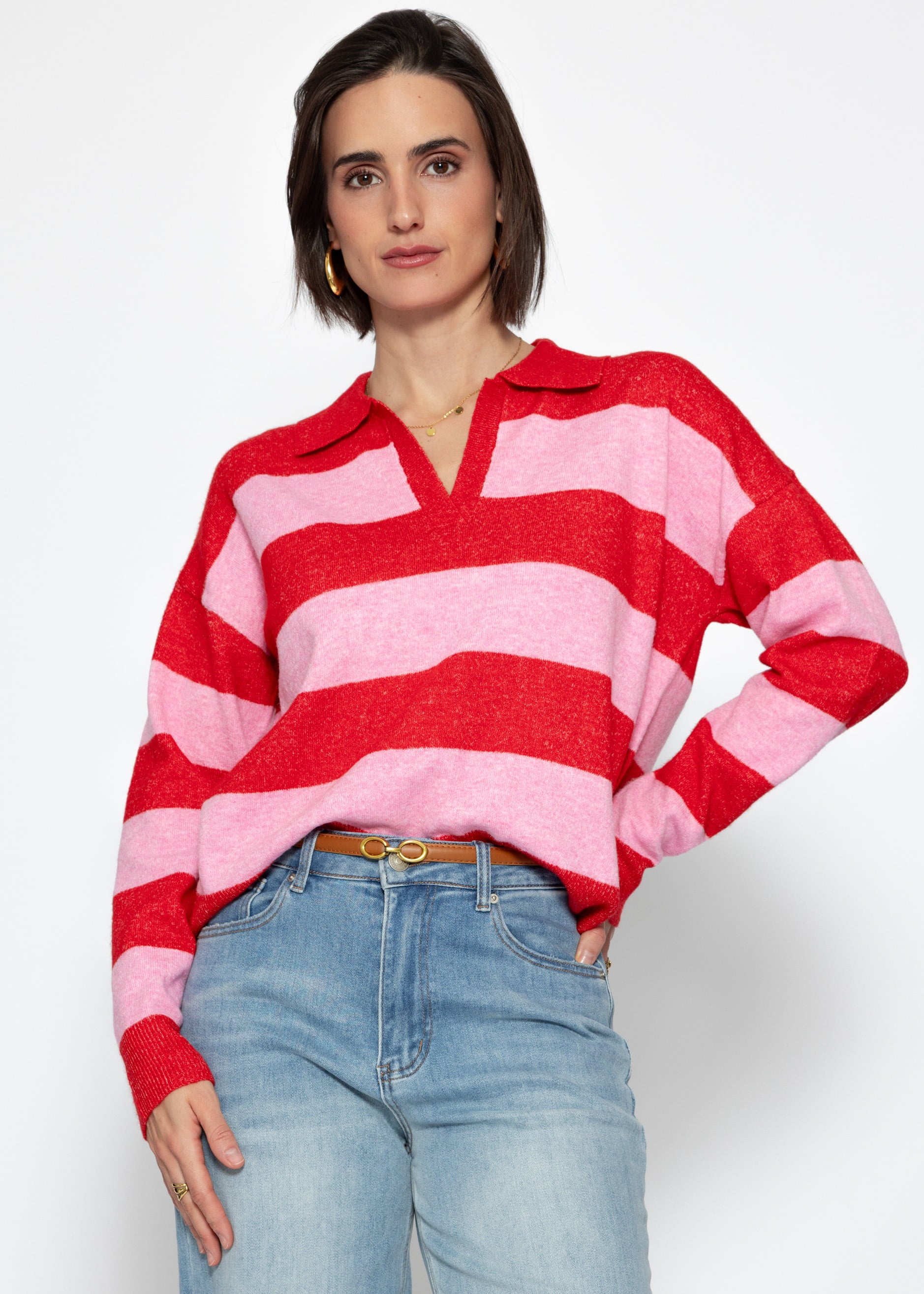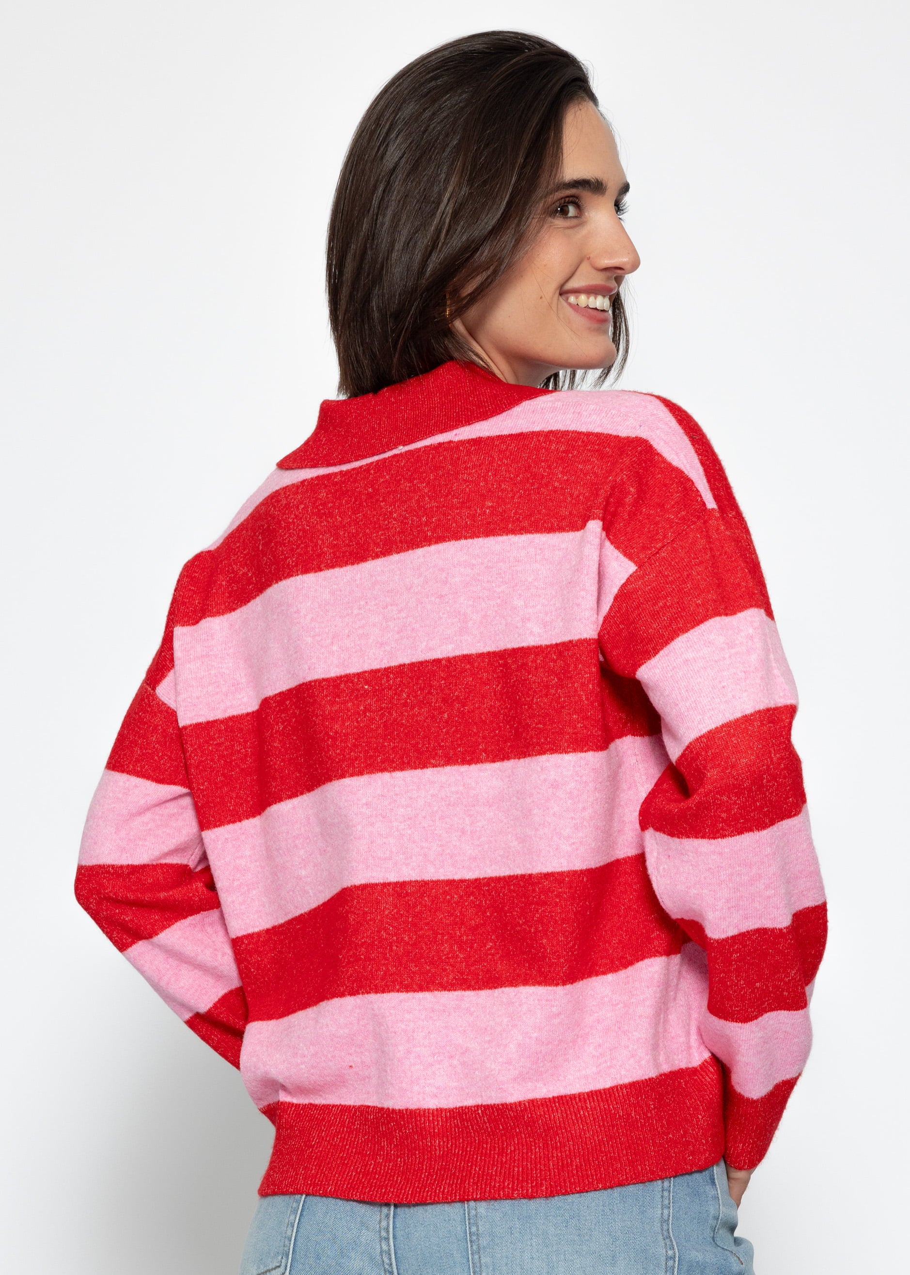 A pink and red striped sweater with a classic polo collar for a modern, expressive look. The striped pattern adds a sporty touch, while the knit fabric ensures a comfortable, cozy feel. Ideal for trendy casual outfits with a statement appeal.
