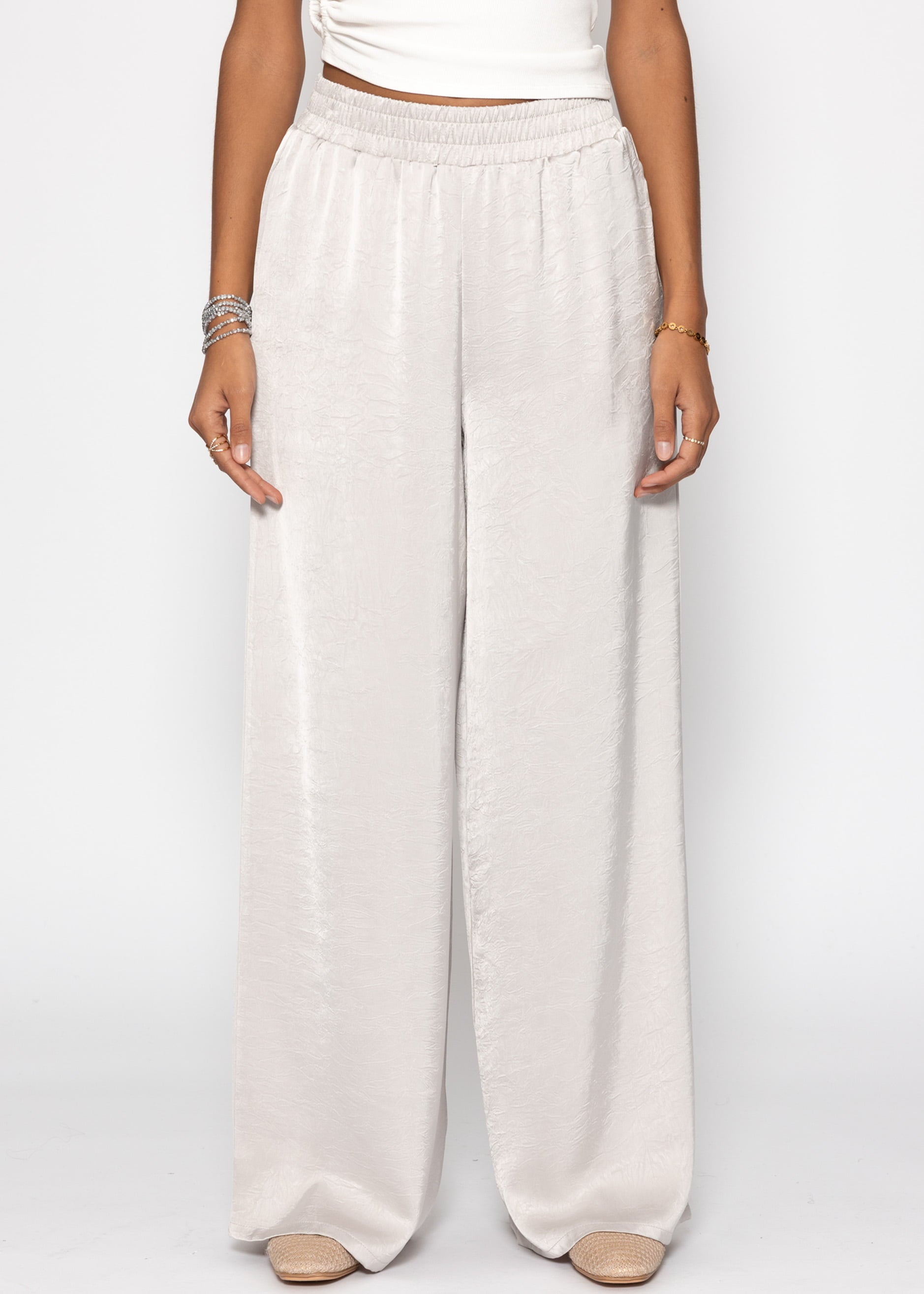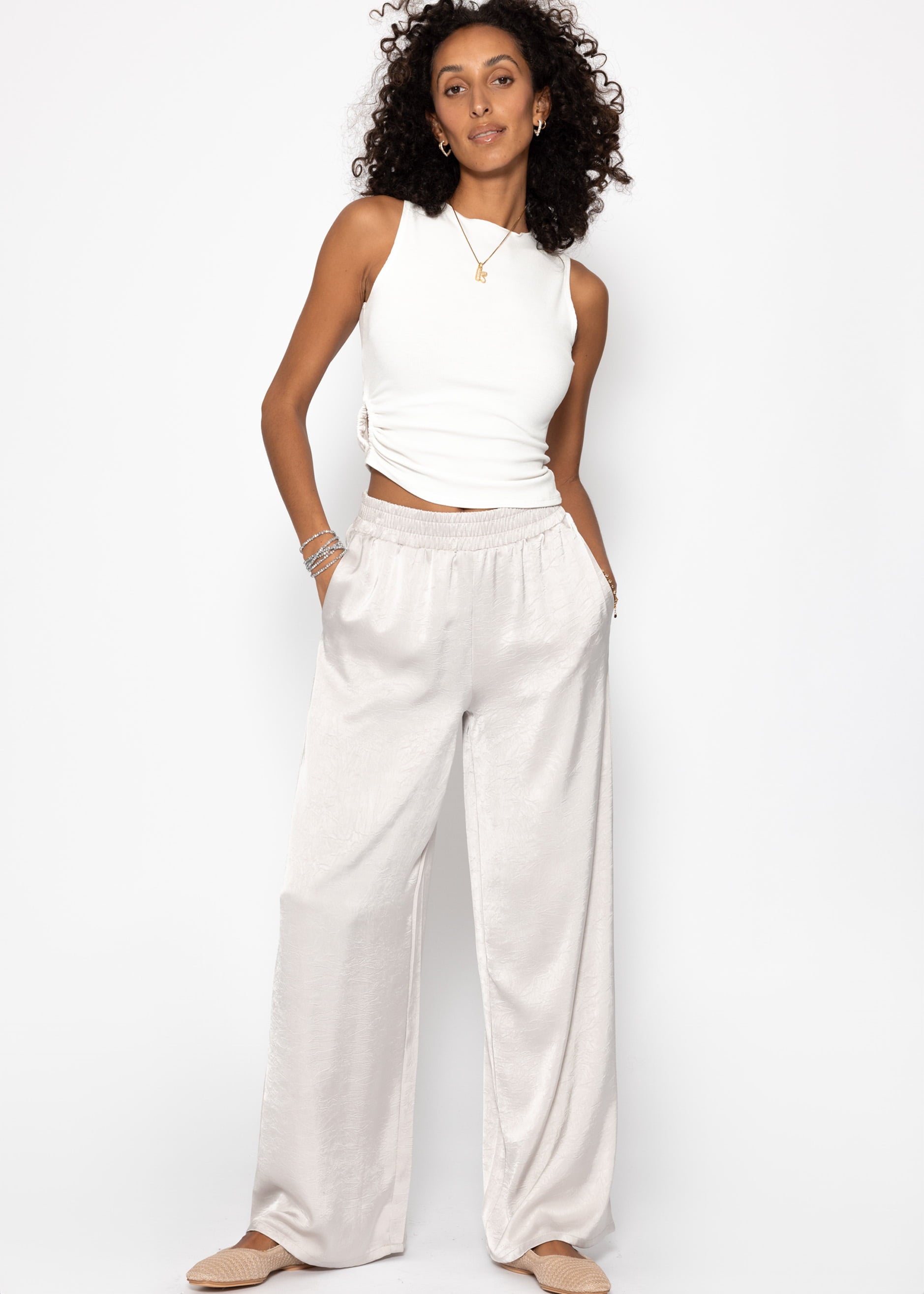 This trendy trousers immediately catch the eye due to the slightly cracked satin. This high -quality satin not only gives the model an elegant shine, but also ensures a particularly pleasant fit. The elastic, gathered covenant enables a flexible fit that adapts comfortably to the body while the loose cut offers enough freedom of movement. The pants are equipped with practical side pockets that are functional and provide a sporty touch. You can style these pants sporty with sneakers and t-shirt or combined with elegant top and high heels, it will be an outfit.