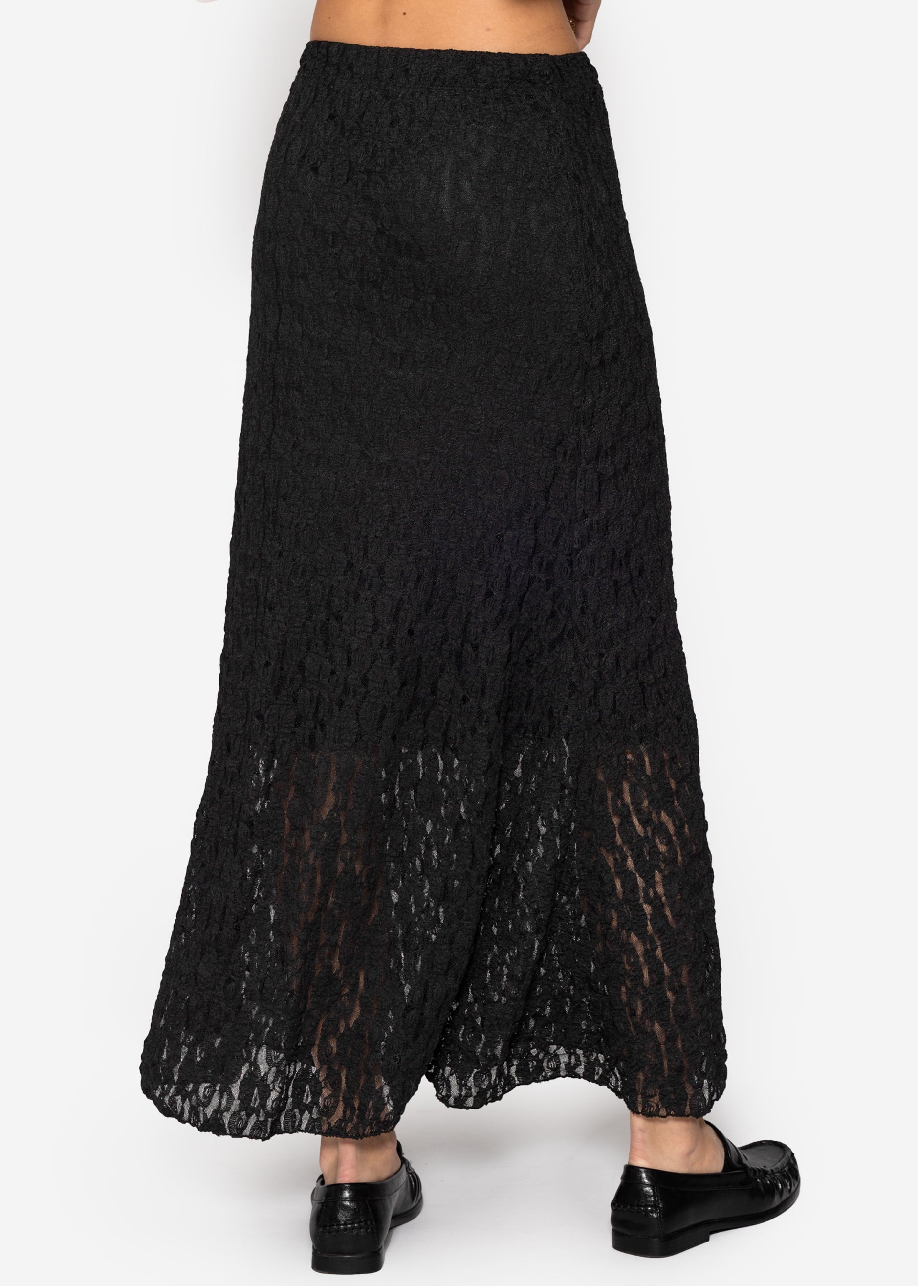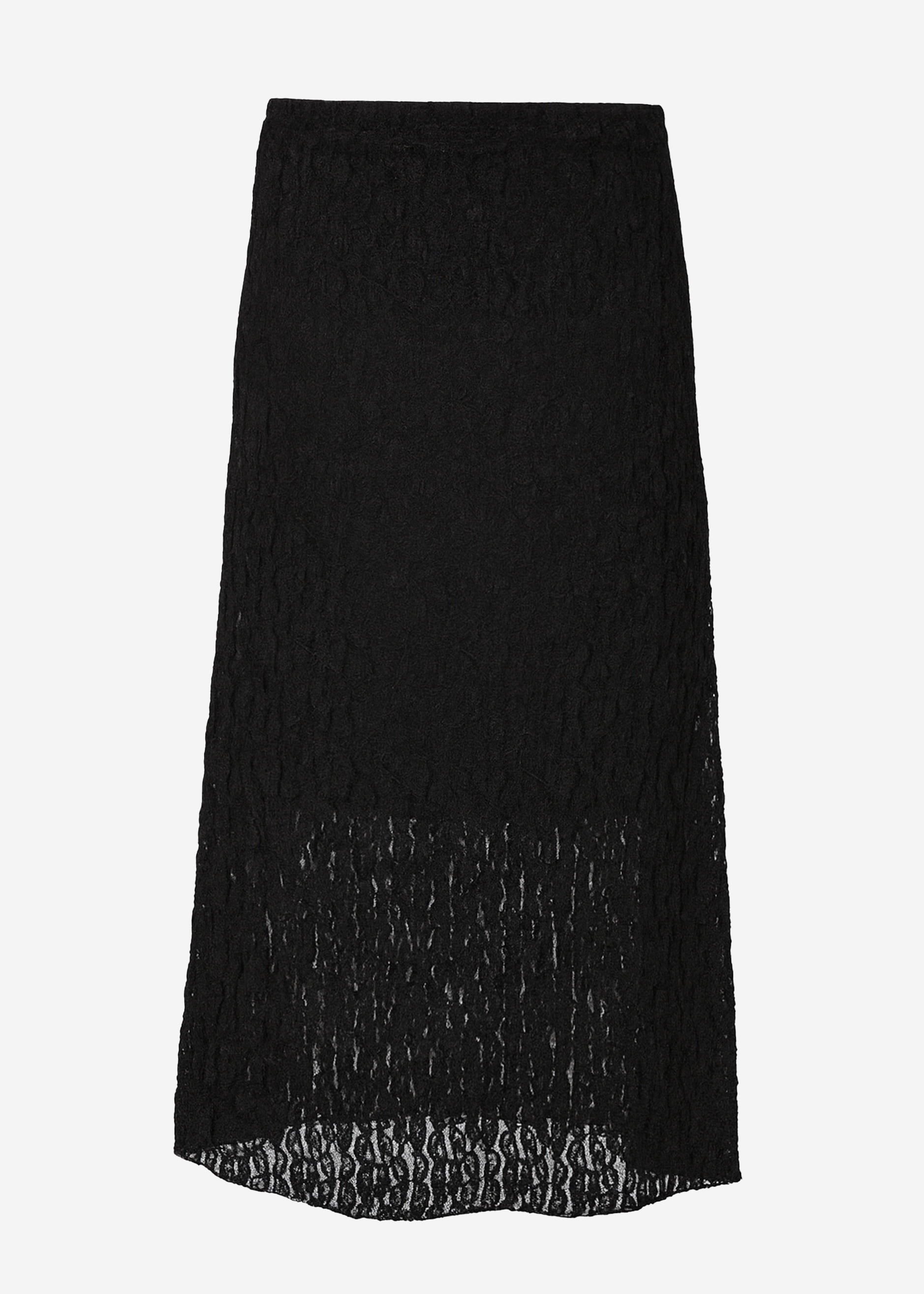 Long skirt in structured, sheer black lace. Fitted, elasticated waistband for a feminine silhouette. An elegant statement piece for modern evening and layered looks.