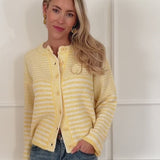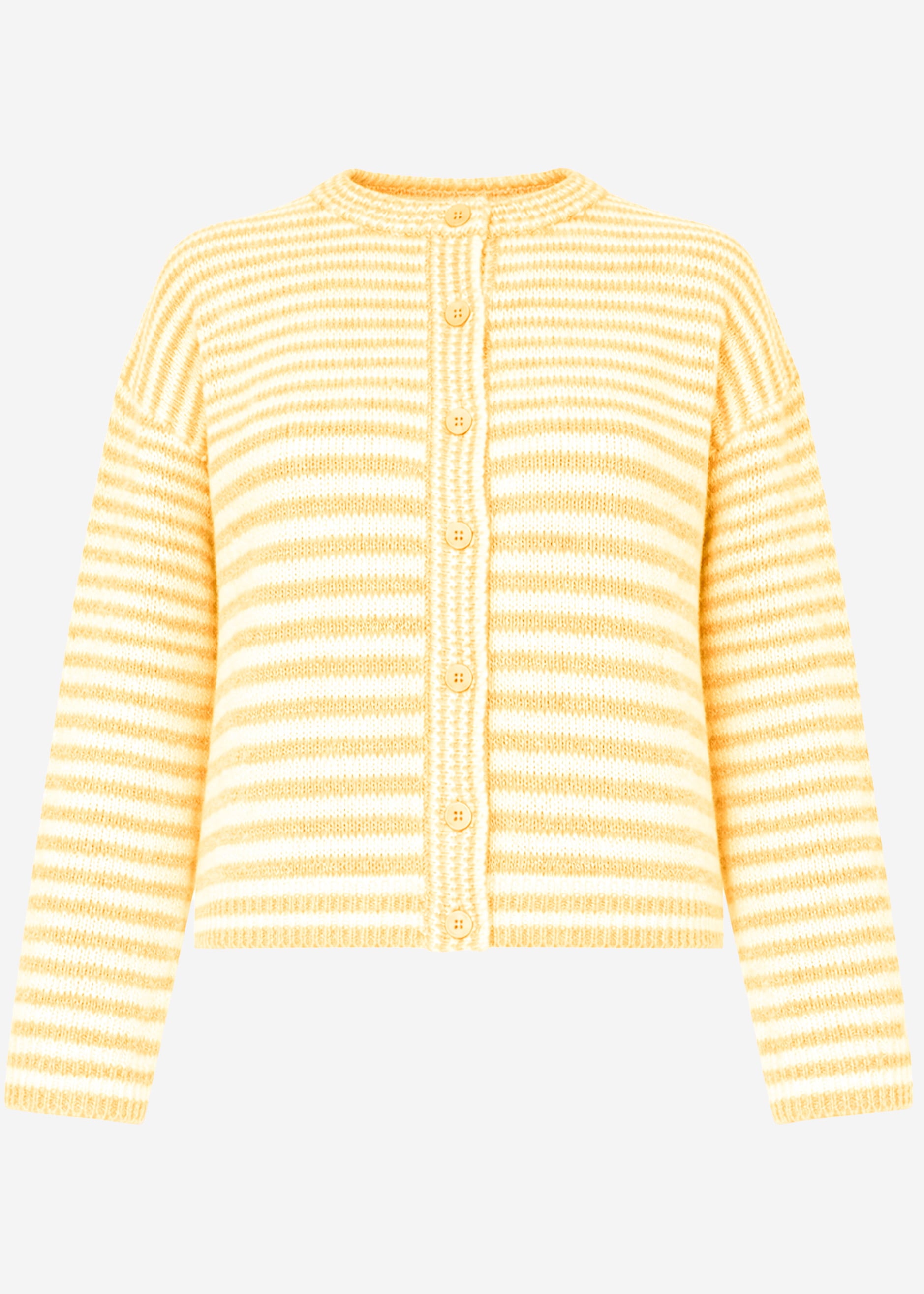 Cardigan with a graphic striped pattern in soft yellow and off-white tones for a fresh, modern look. The clean striped design is stylishly complemented by the full button placket. The relaxed fit and soft knit fabric ensure comfortable wear.