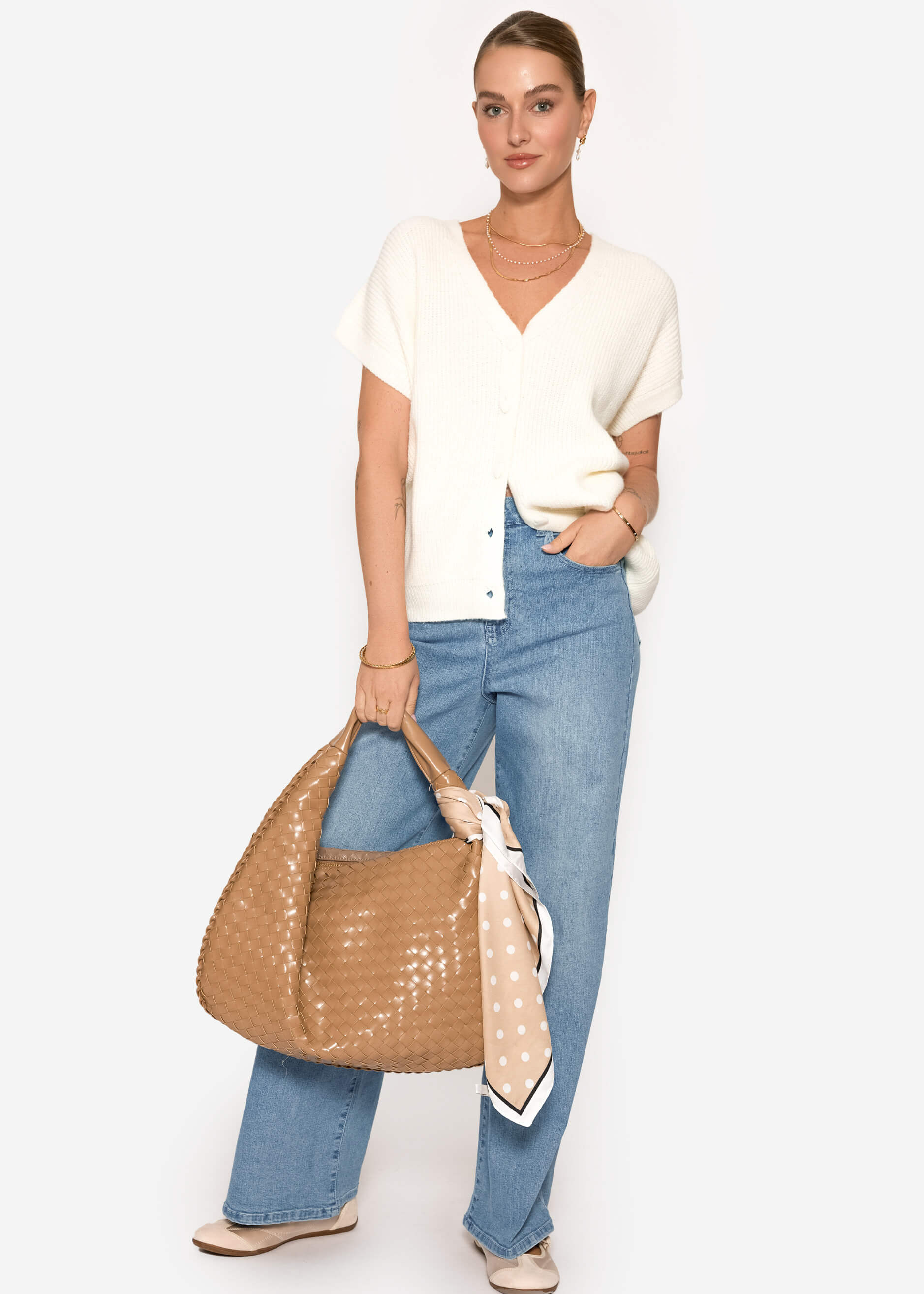 Die Strickweste mit Herzknöpfen in Offwhite hat kurze Ärmel, einen lässigen Oversize-Schnitt und weiches Material. Der V-Ausschnitt und die Herzknöpfe setzen verspielte Akzente.