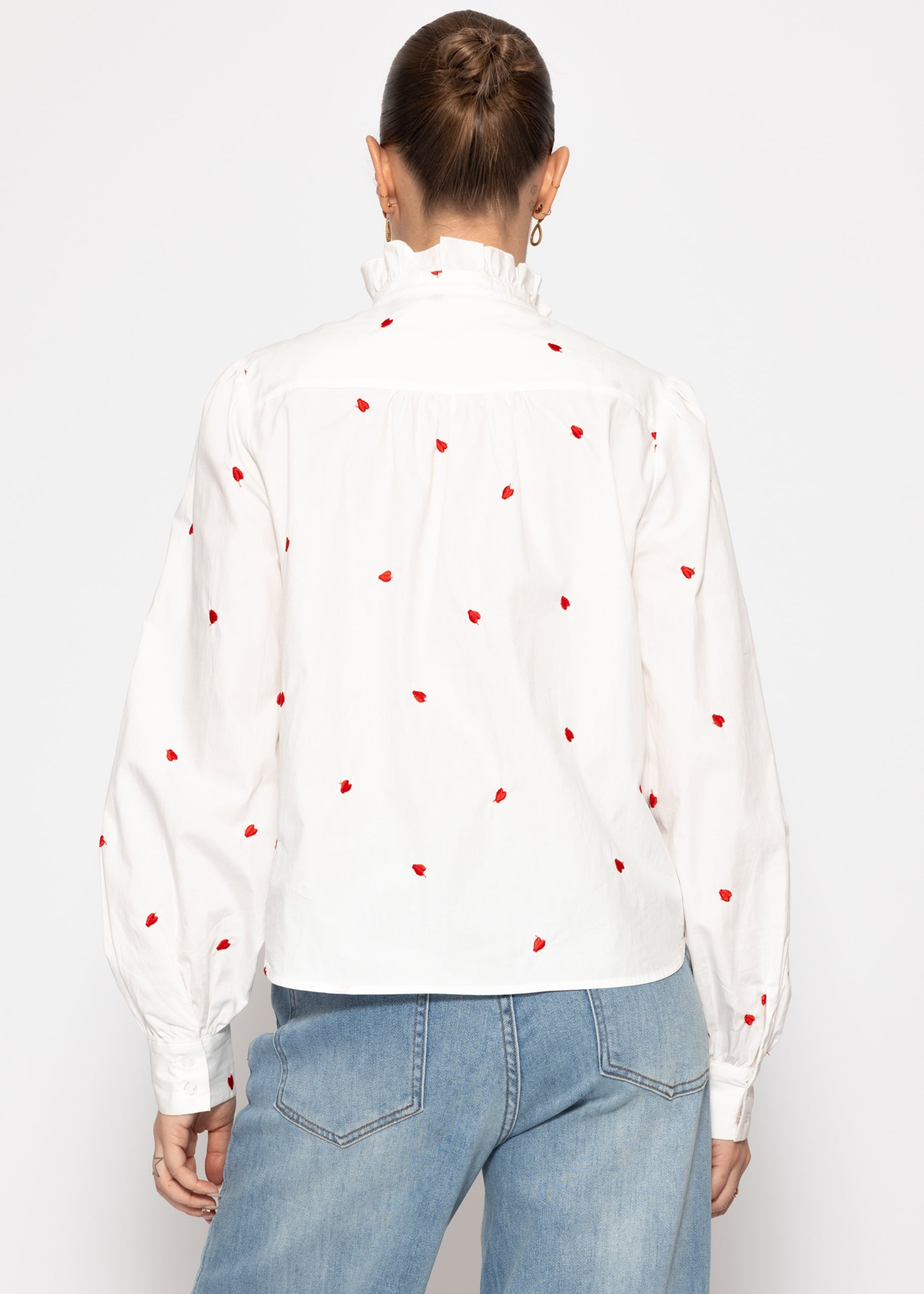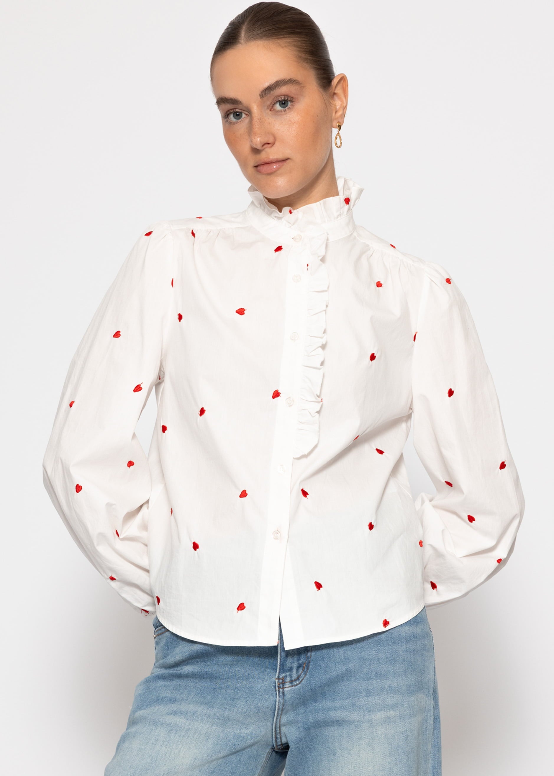 This charming blouse, crafted from high-quality cotton, combines timeless elegance with a touch of romance. The intricate heart embroidery adds a touch of love, while the classic collar, cuffs, and full-length button placket with delicate flounces add a feminine touch. The loose fit makes the blouse comfortable to wear and versatile—whether casual with jeans or chic with a skirt.