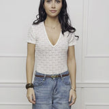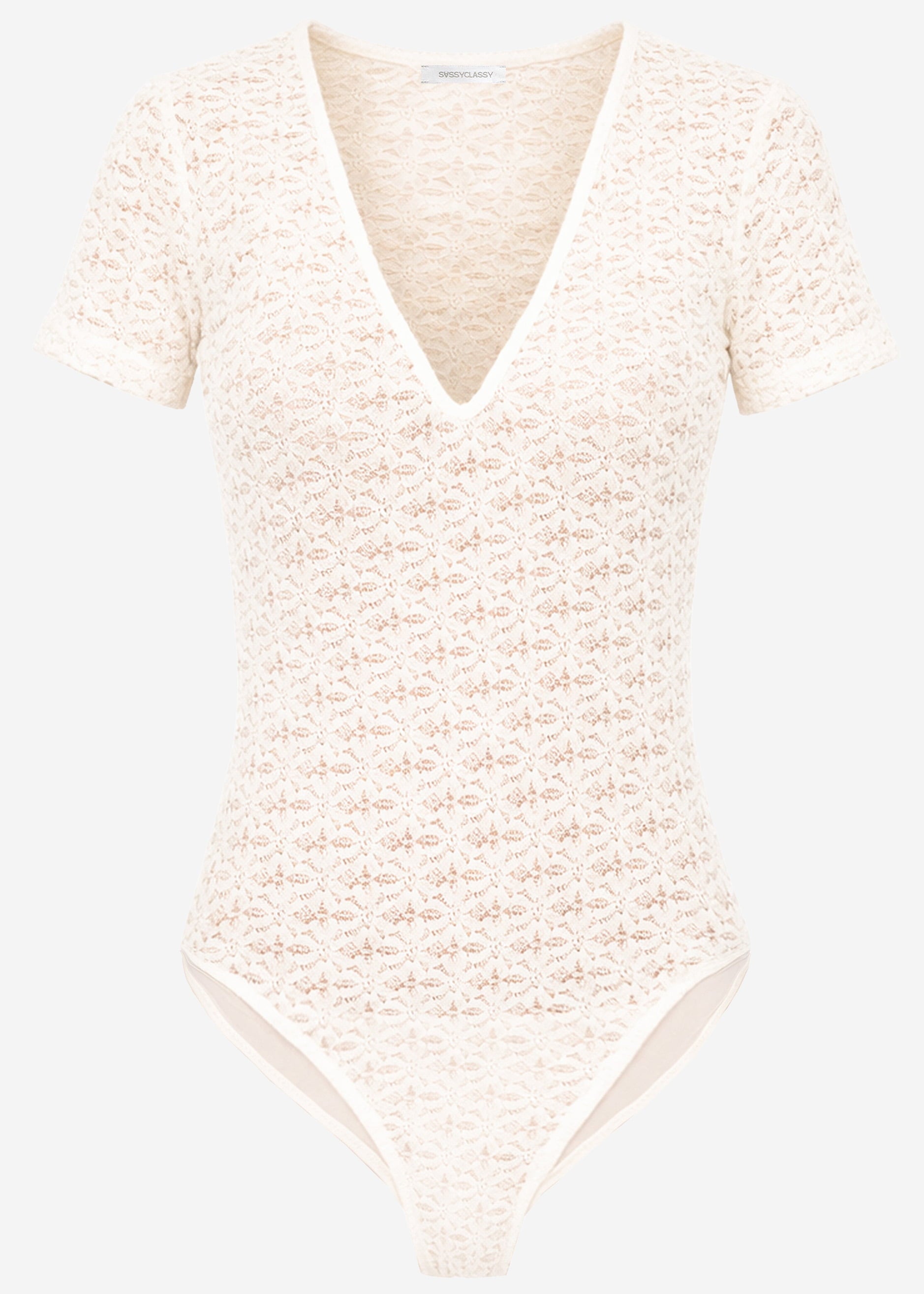 Delicate short-sleeved bodysuit in off-white floral lace. The figure-hugging cut features a deep V-neck and short sleeves for an elegant silhouette. The fine all-over lace pattern creates a romantic and stylish look.