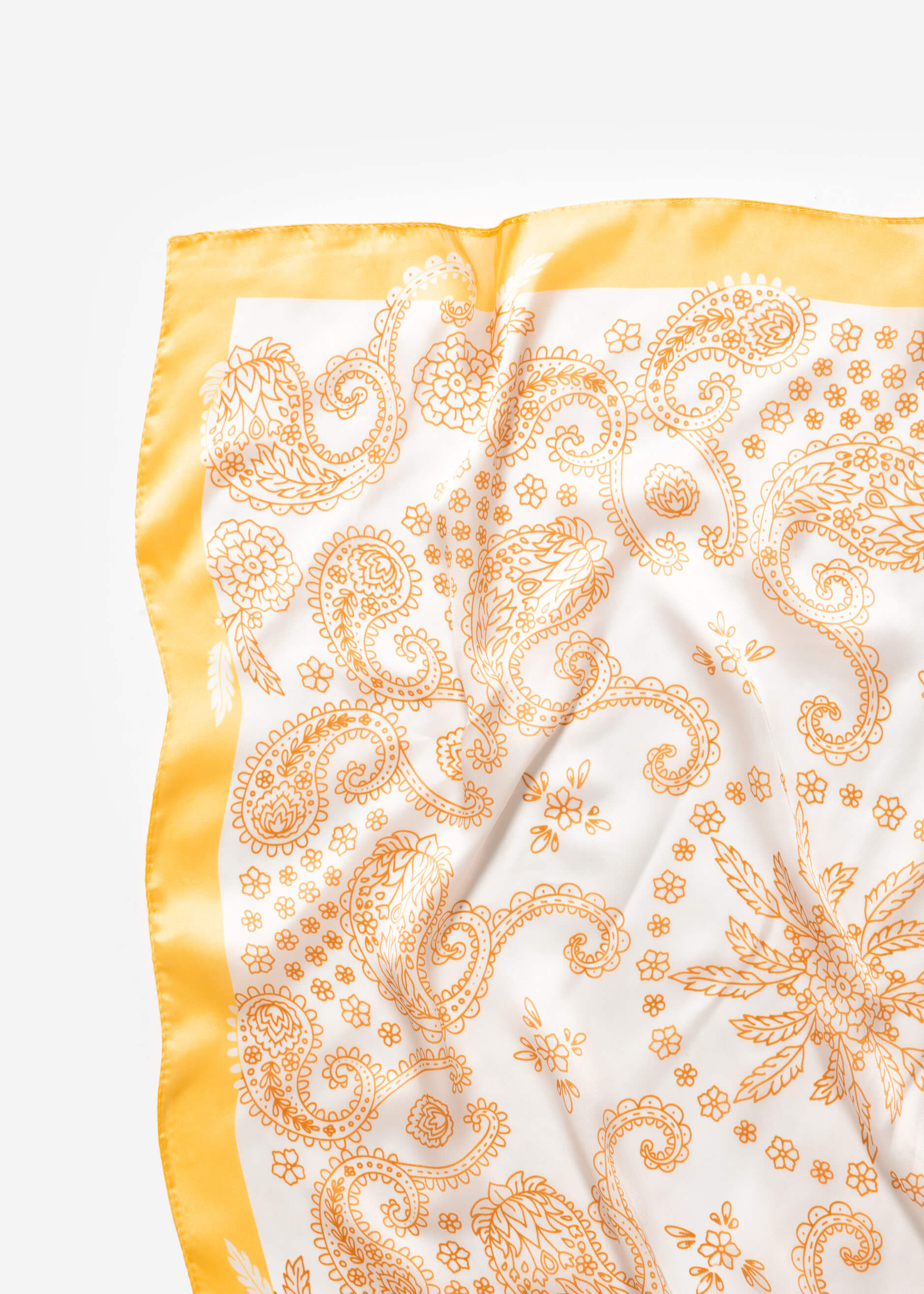 A fine yellow scarf with a classic paisley pattern and a touch of silk. The smooth, slightly lustrous fabric creates a high-quality, elegant look, while the detailed print lends the design a timeless touch. A sophisticated accessory with a pleasantly soft feel.