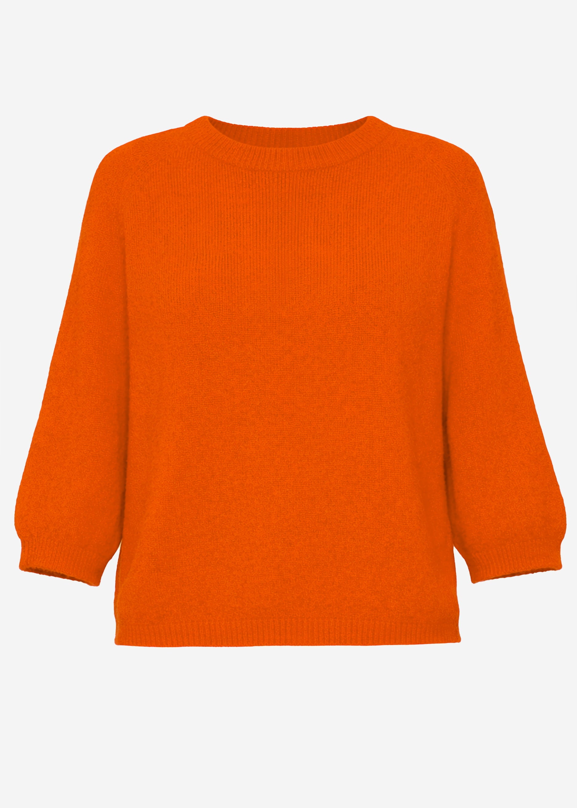 This orange knit top combines timeless elegance with cozy comfort. It features a round neckline, half-length sleeves, and a relaxed fit.