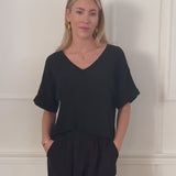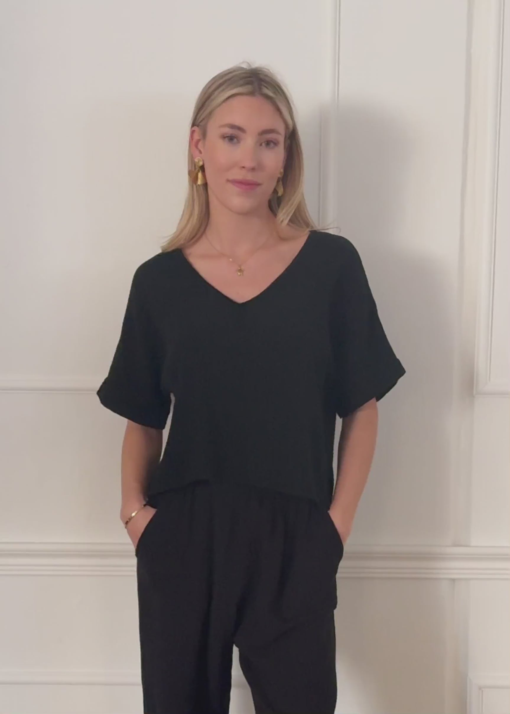 This light and airy muslin shirt is an absolute must-have for style-conscious wardrobes. The design features a generous V-neckline that creates a beautiful neckline, while playful lacing at the back creates an unexpected eye-catcher. Wide, short sleeves emphasize the relaxed fit and casual character of the shirt. Made from cotton muslin, the top feels soft and comfortable against the skin. Whether worn with tight-fitting pants, flowing maxi skirts or comfy shorts, this shirt adds a touch of carefree elegance to any outfit.