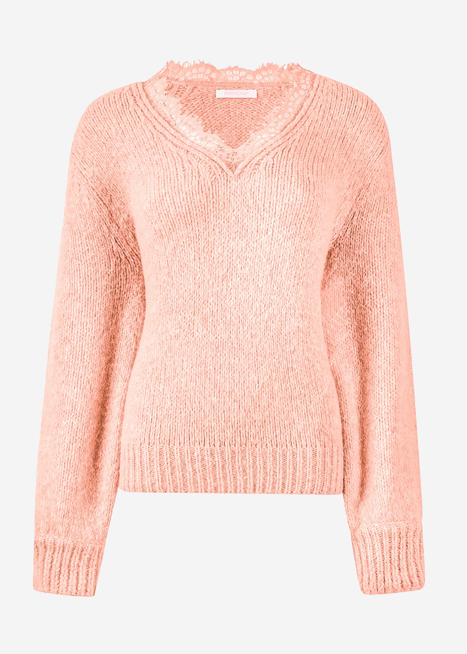 If you're looking for a sweater with timeless beauty, this garment is the perfect choice. This style features long sleeves with ribbed cuffs and a ribbed hem. With its oversized fit and dropped shoulders, the sweater defines a modern silhouette that is both casual and stylish. The classic V-neckline is embellished with lace, giving the sweater a feminine, romantic touch and creating a harmonious connection between the knitwear and the delicate elegance of the lace. Wear it with your favorite jeans and sneakers for a cozy everyday look.