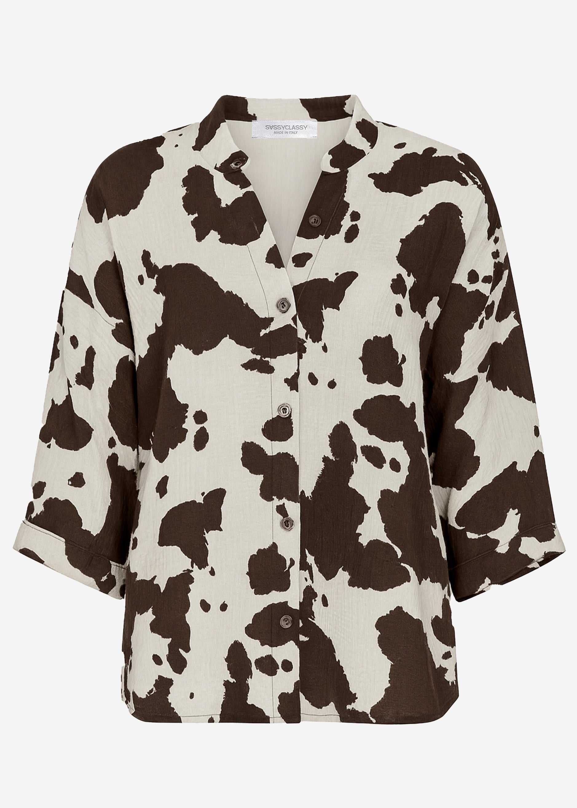 This cow print muslin blouse gives you a totally trendy look. It features classic details like a stand-up collar and a full-length button placket with brown buttons. Short sleeves with ruffles and an oversized cut give the blouse a sporty touch.