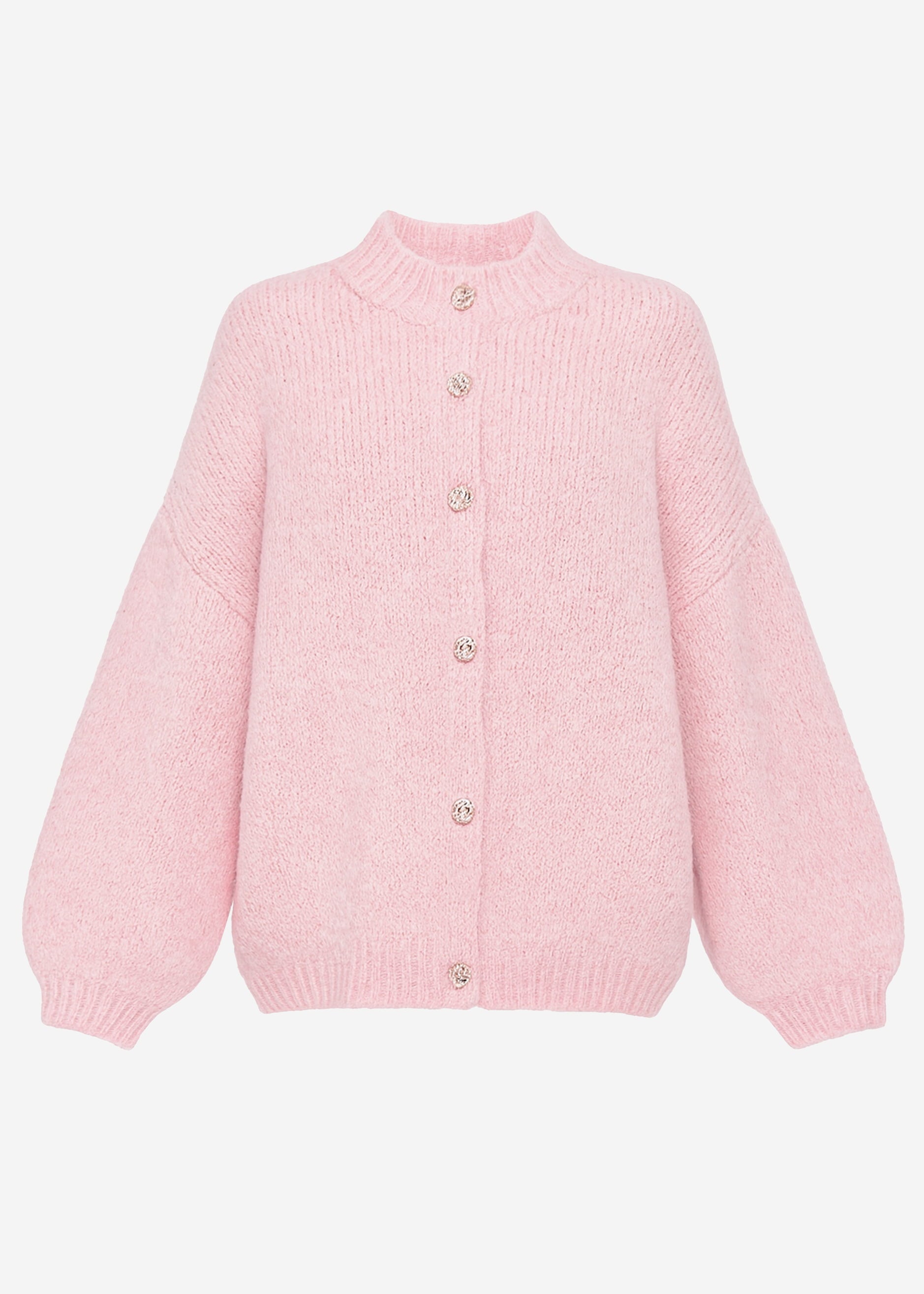 Delicate pink cardigan in chunky knit fabric with shiny decorative buttons. Loose oversized fit with a round neckline and long sleeves. Soft knit texture for a cozy, feminine look.