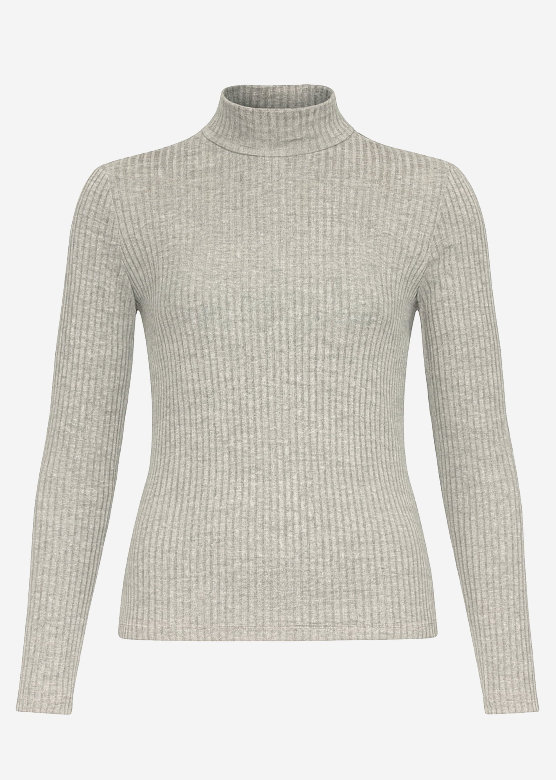 Ribbed long-sleeved shirt in gray with a narrow stand-up collar for a clean, feminine look. The figure-hugging fit and soft fine knit make it a versatile basic for layering and everyday outfits.