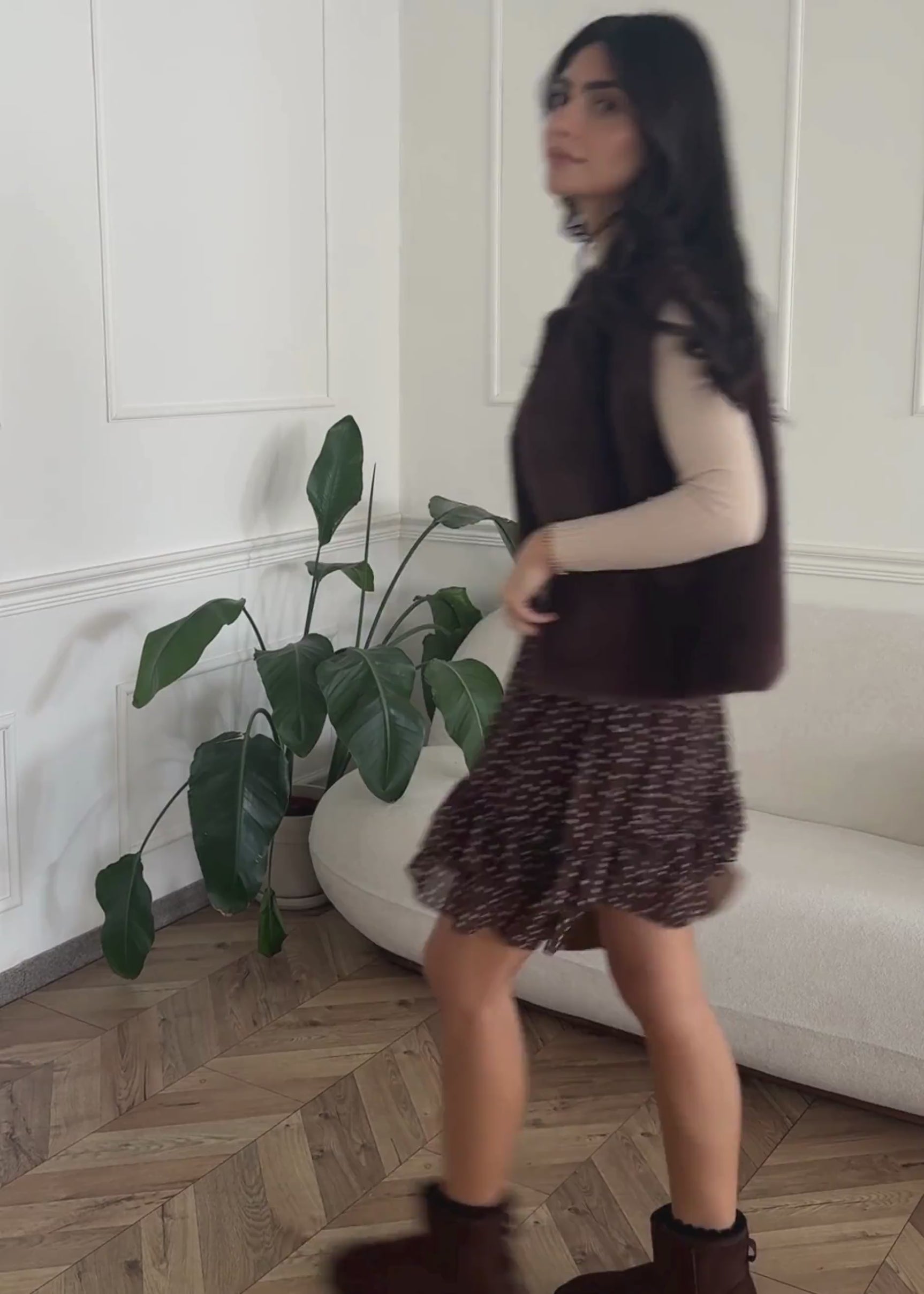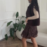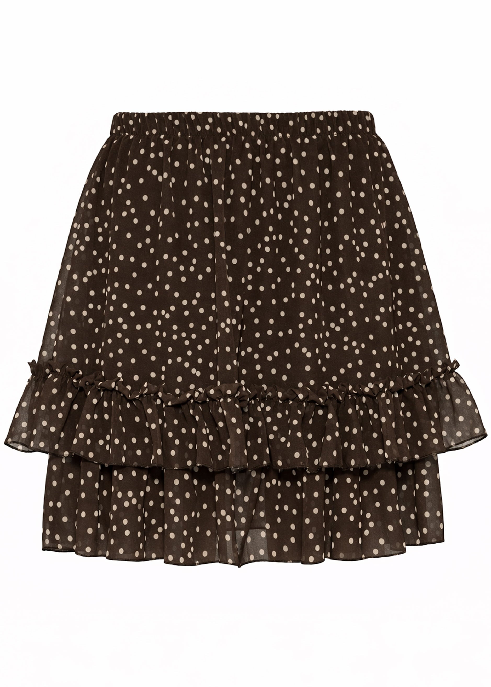 Brown skirt with a delicate dot pattern and double-layered flounce hem. Lightweight, flowing fabric with an elastic waistband for a comfortable fit.