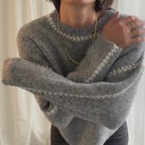 This cozy sweater impresses with its modern design and distinctive contrasting stitching. The soft knit material ensures a comfortable fit and makes the sweater the ideal companion for cool days. The decorative stitching along the shoulders, sleeves, and round neckline add subtle accents and lends the sweater an elegant touch. The loose fit and slightly dropped shoulders give it a casual yet stylish look.