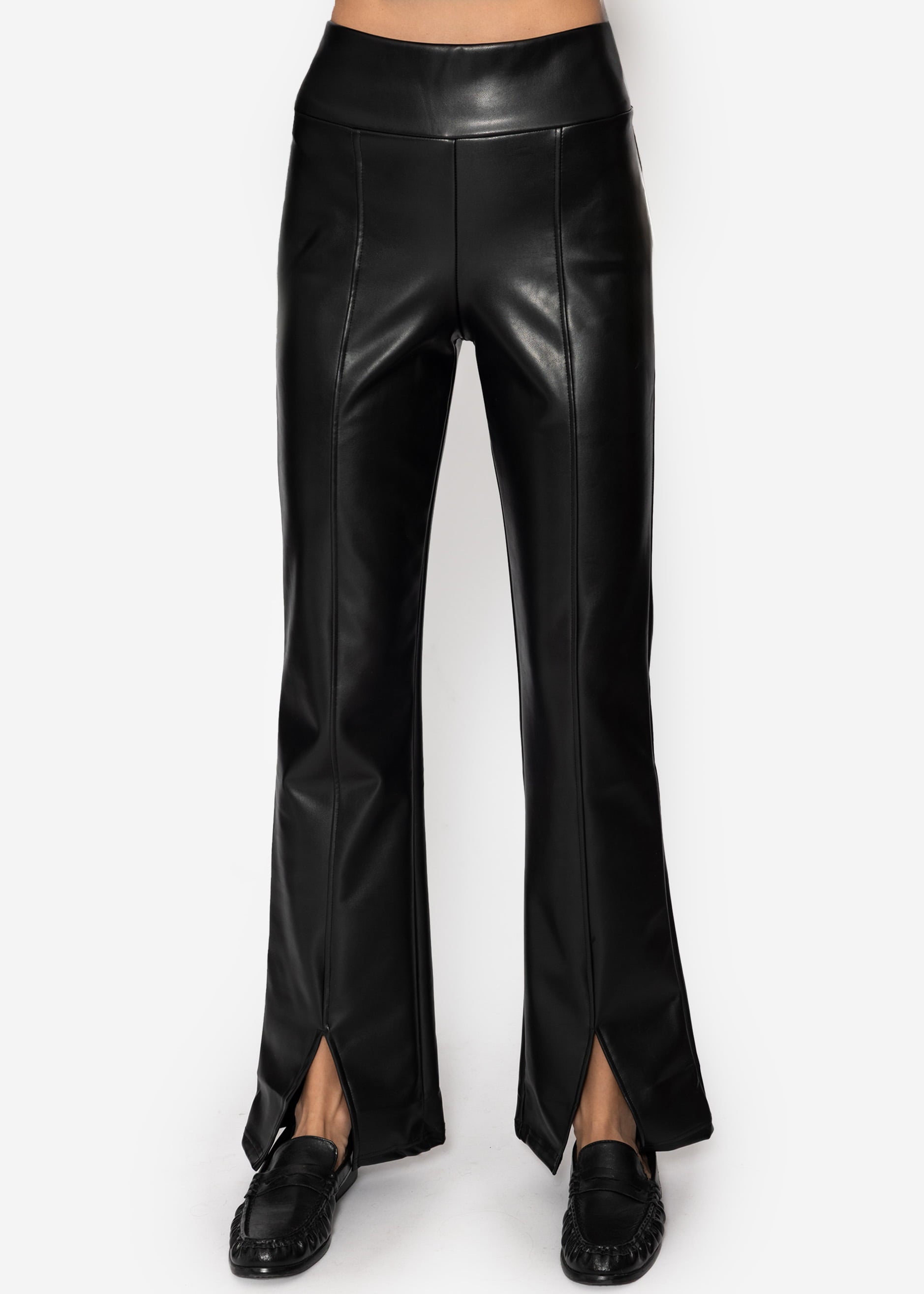 Faux leather thermal leggings with dividing seams and hem slit in black