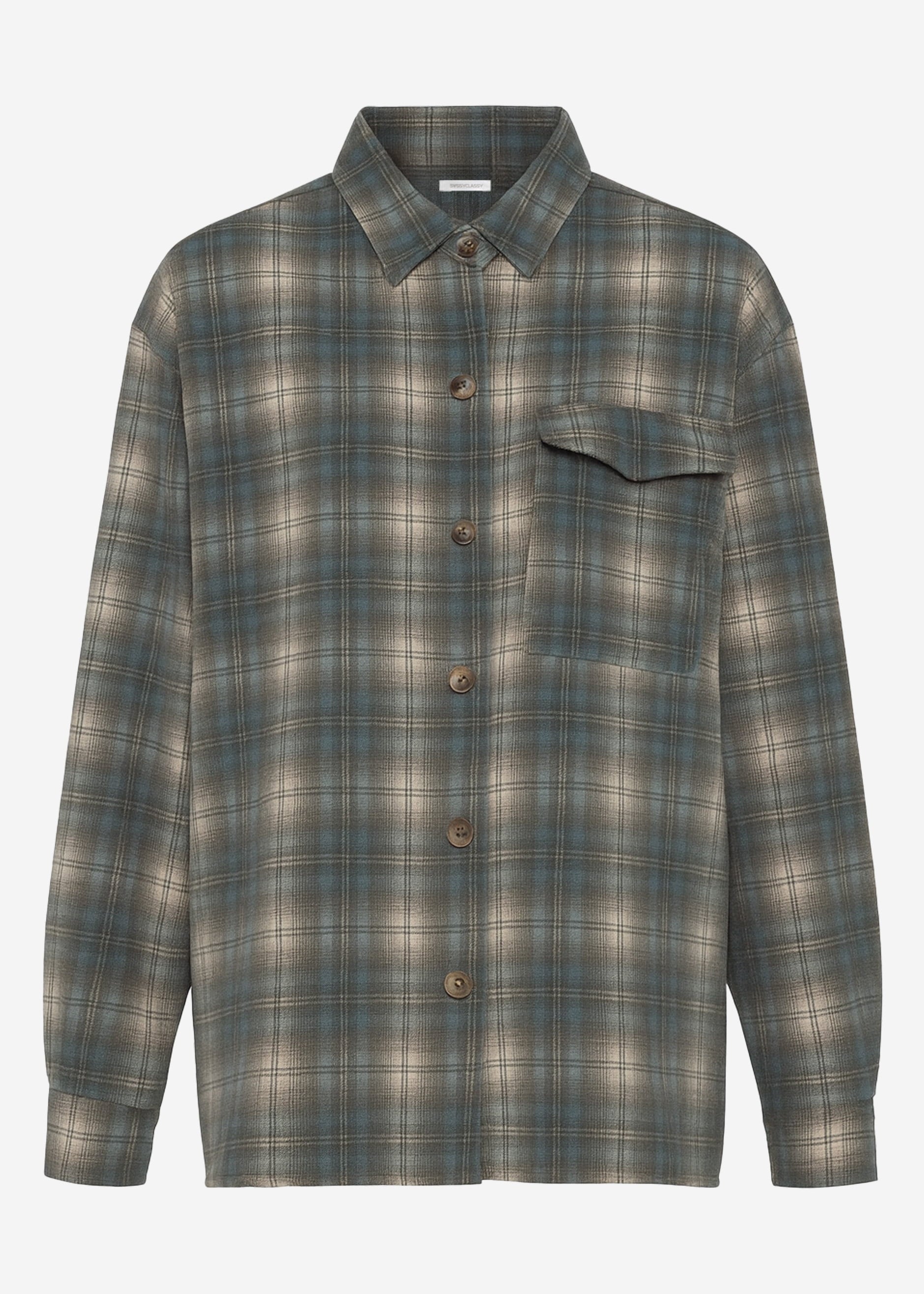 Gray oversized shirt blouse with classic check pattern in shades of blue and beige. Loose fit with chest pocket and full button placket. Soft material for a casual, modern look.