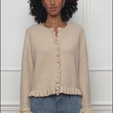 This cardigan combines feminine details with cozy comfort. The soft knit fabric feels pleasant against the skin, making it the perfect everyday companion. The delicate ruffles along the button placket, hem, and cuffs add a special touch. They give this classic cardigan a playful, elegant touch. The slightly loose fit makes it versatile, for example, with elegant trousers or a more relaxed look with jeans.