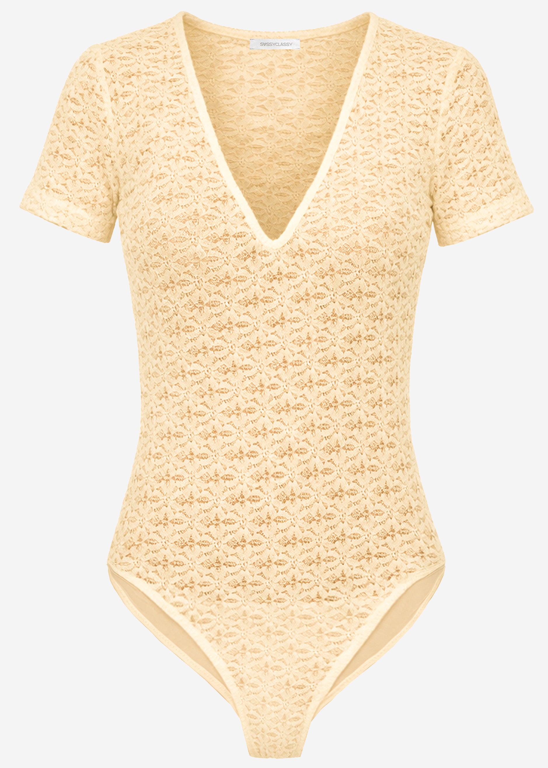 Delicate short-sleeved bodysuit in buttery yellow floral lace. The figure-hugging cut features a deep V-neck and short sleeves for an elegant silhouette. The fine all-over lace pattern creates a romantic and stylish look.