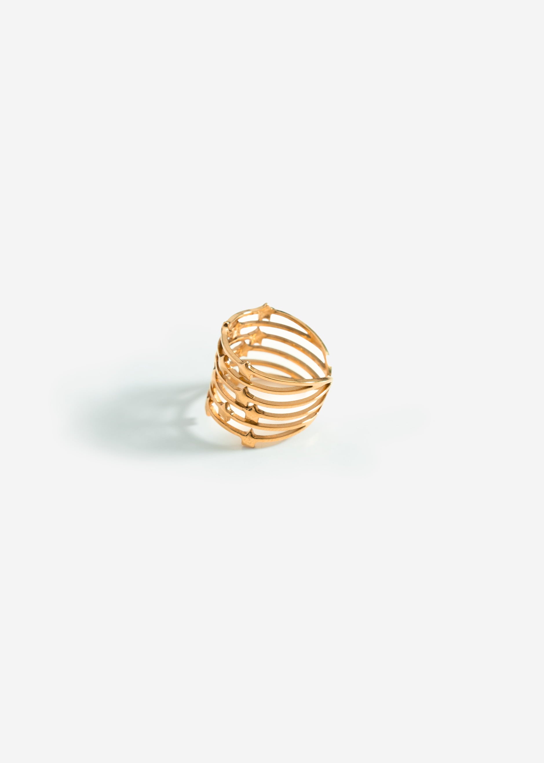This gold-colored ring captivates with its multi-row design and delicate star details, which give it a playful yet elegant look. The open, easily adjustable design adds a modern touch and makes the ring a stylish highlight—perfect for adding a touch of glamour to any look.