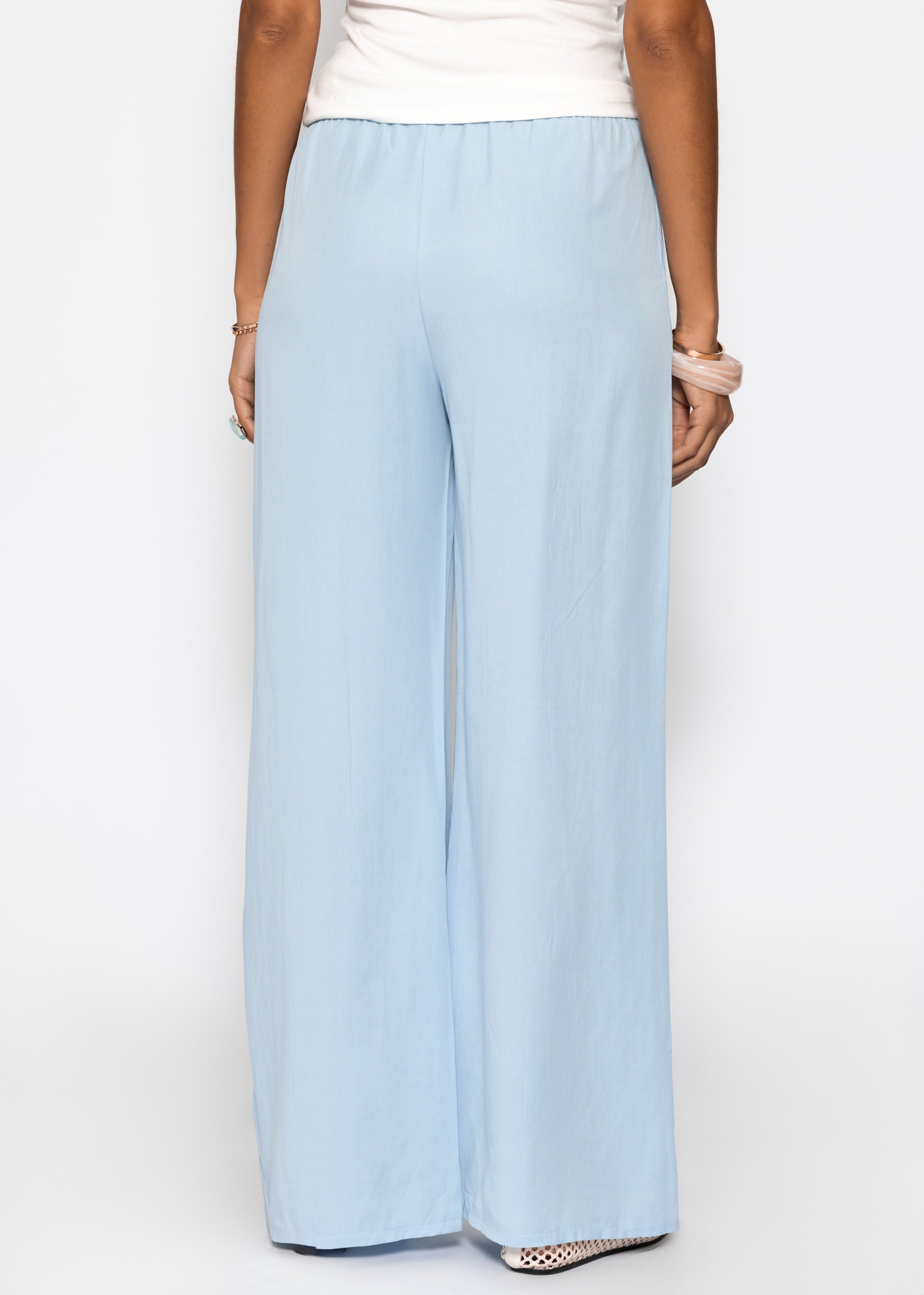This wide trousers combine casual comfort with feminine details. It is made of a flowing material that ensures a particularly pleasant fit. The elastic waistband adapts comfortably to the waist and offers additional comfort. A special highlight are the delicate ruffles that run vertically along the pants and give the pants a playful and at the same time stylish note. Whether with a simple top and sandals for everyday life or with a blouse shirt for an elegant leisure look - this versatile trousers is the perfect companion for every occasion.